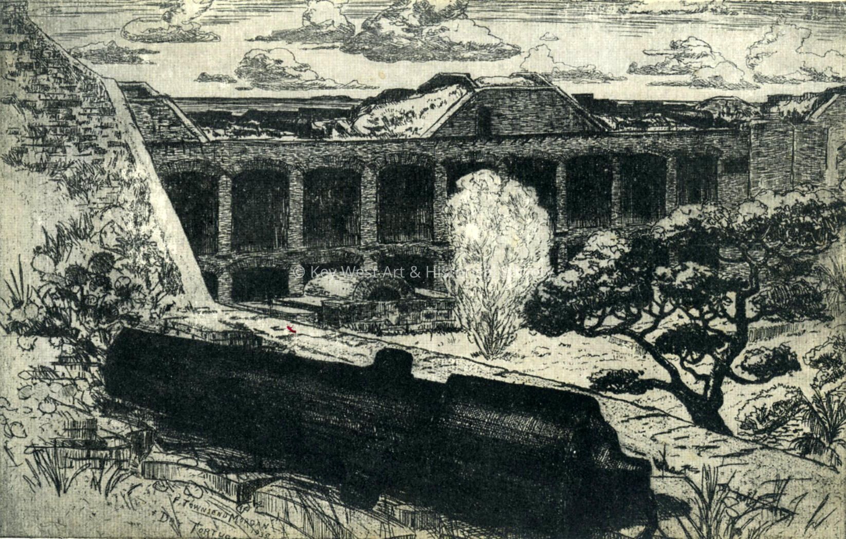 Postcard depicting a cannon resting on the Fort Jefferson parapet. Notation on verso reads, 'Fort Jefferson, Dry Tortugas, Florida. Original etching by F. Townsend Morgan - in the Collection of the Key West Administration.'Subject Place