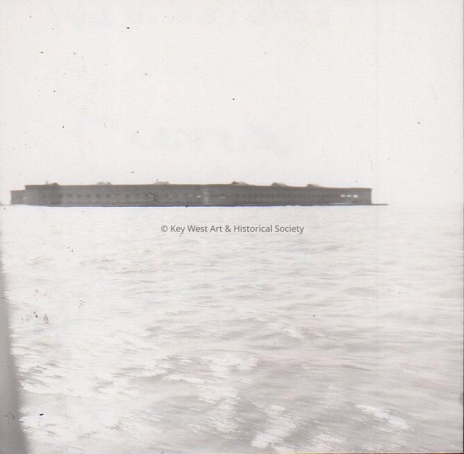 Black and white photograph of Fort Jefferson in the Dry Tortugas viewed from the water.