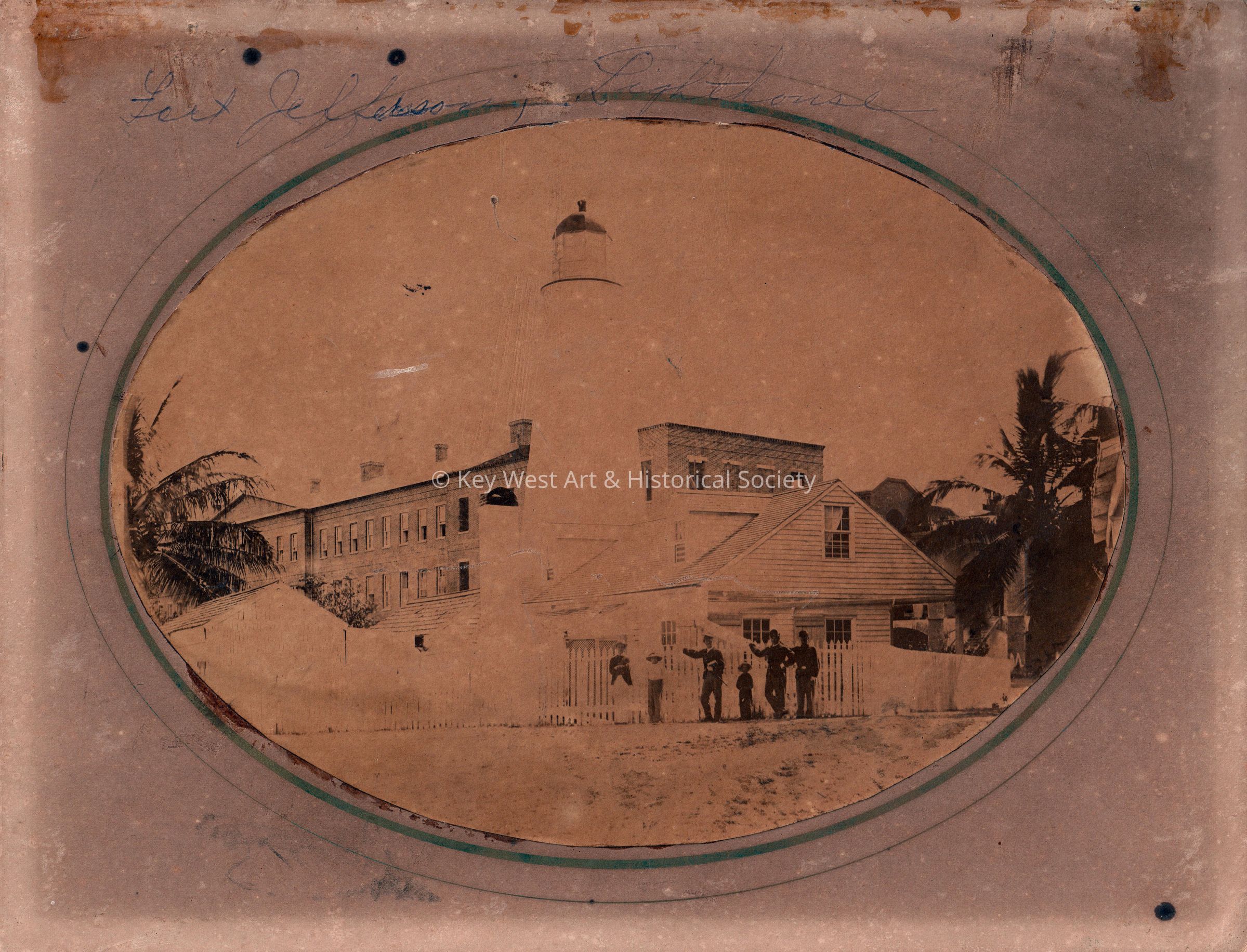 Fort Jefferson Lighthouse with soldiers and visitors.