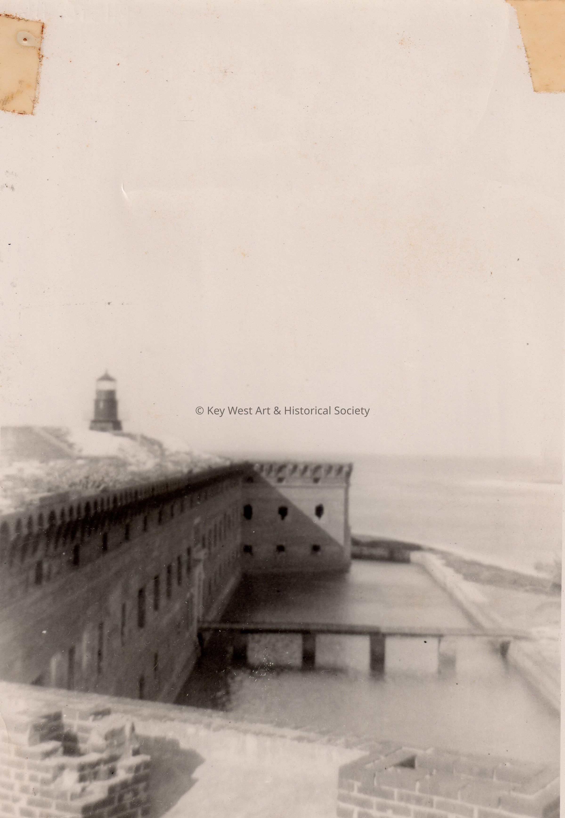 Black and white photograph of Fort Jefferson, the Garden Key Lighthouse and the surrounding moat.