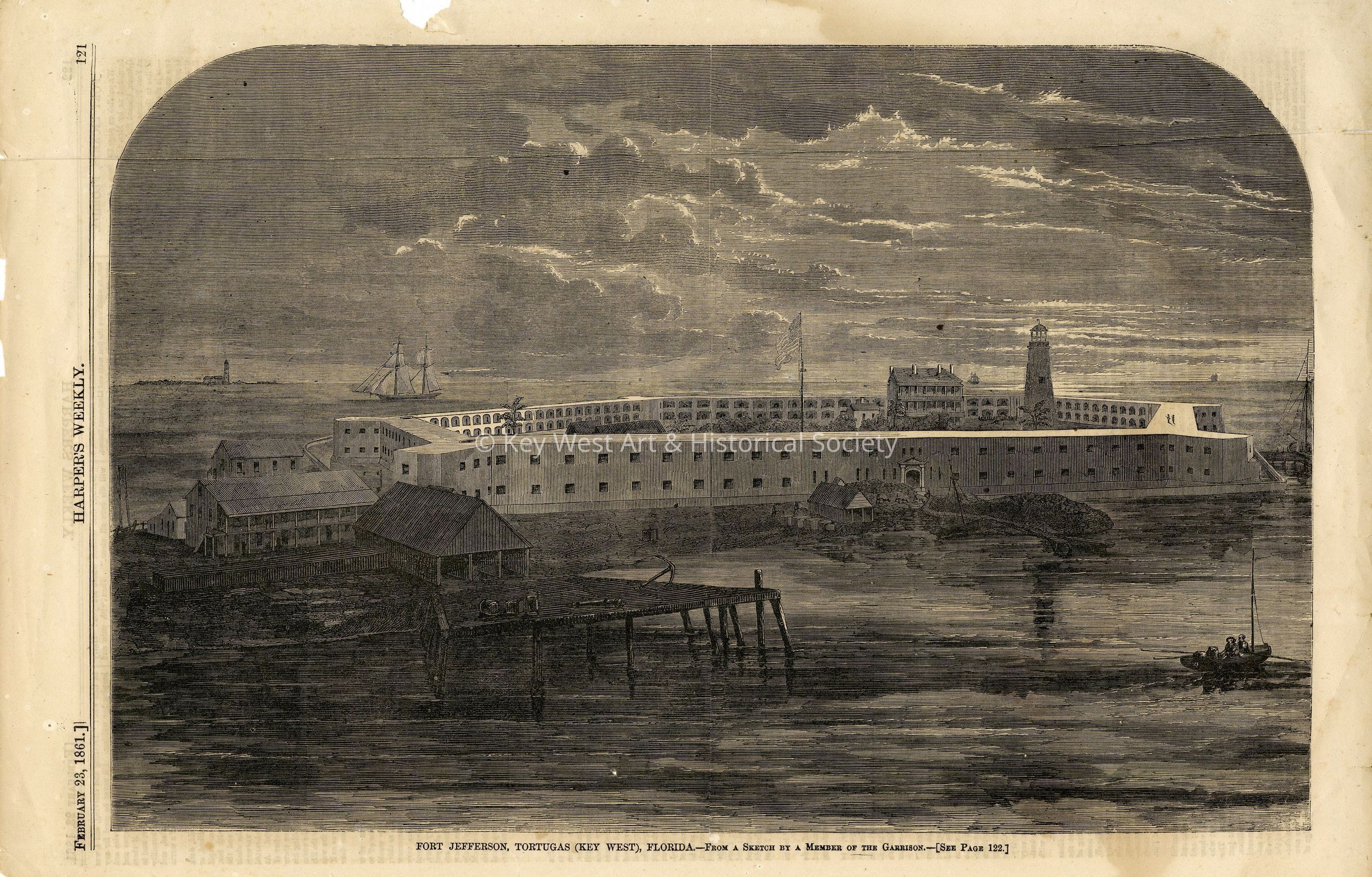 Engraving depicting Fort Jefferson in the Dry Tortugas that appeared in Harper's Weekly taken from a sketch by a member of the Garrison.Collection