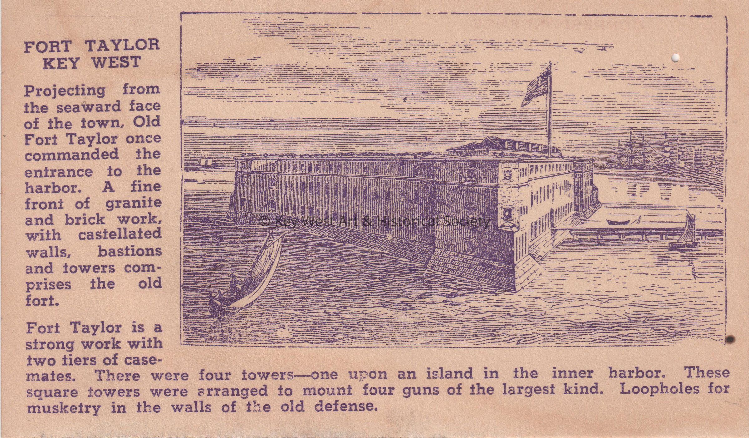 Postcard depicting Fort Taylor surrounded by water and ships. The caption reads, ‘Fort Taylor Key West. Projecting from the seaward face of the town, Old Fort Taylor once commanded the entrance to the harbor. A fine front of granite and brick work, with castellated walls, bastions and towers comprises the old fort. Fort Taylor is a strong work with two tiers of casemates. There were four towers - one upon an island in the inner harbor. These square towers were arranged to mount four guns of the largest kind. Loopholes for musketry in the walls of the old defense.‘Subject Place