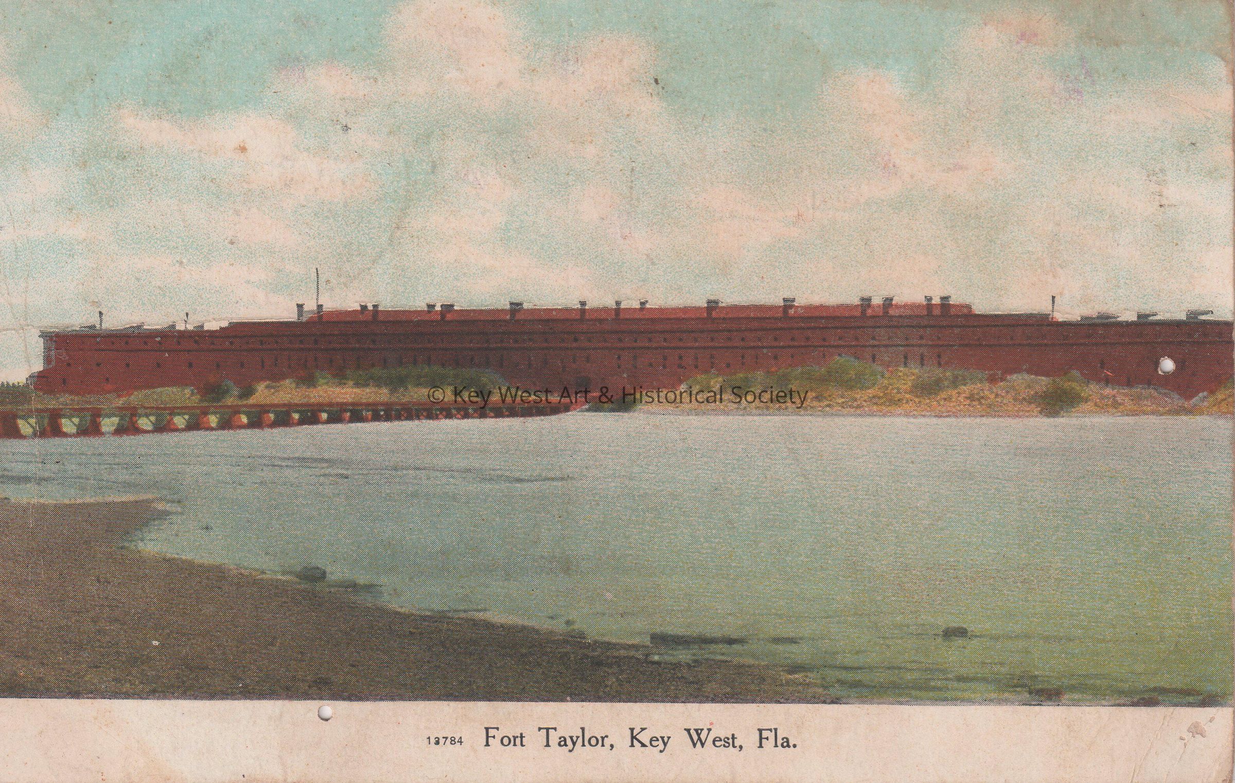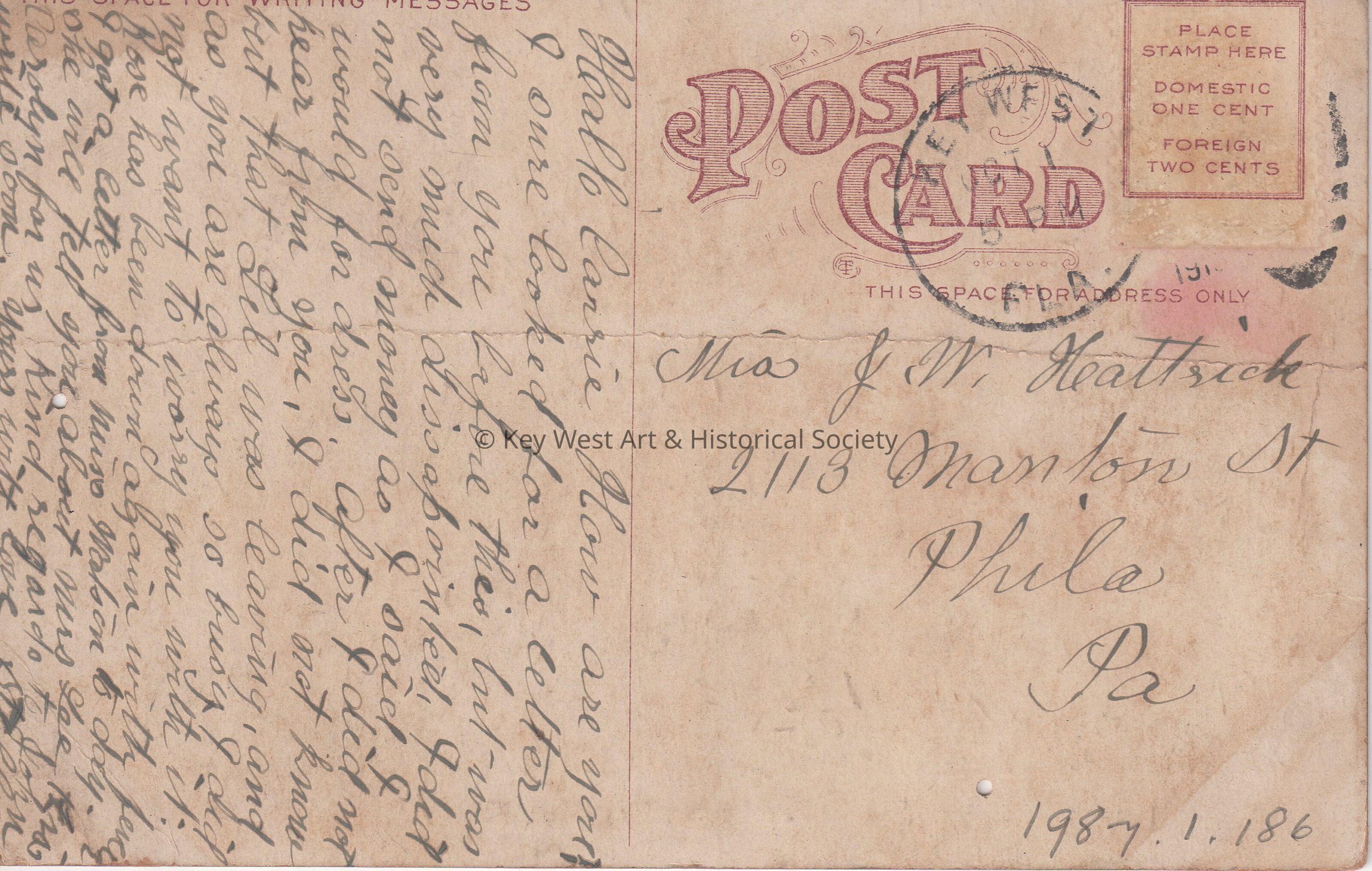 Postcard depicting a red brick fort near the water. The caption reads, ‘Fort Taylor, Key West.’ The message on the verso reads, ‘Hello, Carrie, How are you? I sure looked for a letter from you before this, but was very much disappointed. I did not send money as I said I would for dress. After I did not hear from you, I did not know but that Lil was leaving, and as you are always so busy, I did not want to worry you with it. Rose has been down again with fever. I got a letter today from Miss Watson. She will tell you about Mrs. Lee. Kiss Carolyn for us. Kind Regards to John. Write Soon. Yours with love, Stella.’ The card is addressed to Mrs. J. W. Hattrick, 2113 Manton Street, Philadelphia, Pennsylvania, and is postmarked Key West, October 1, 1910.Collection