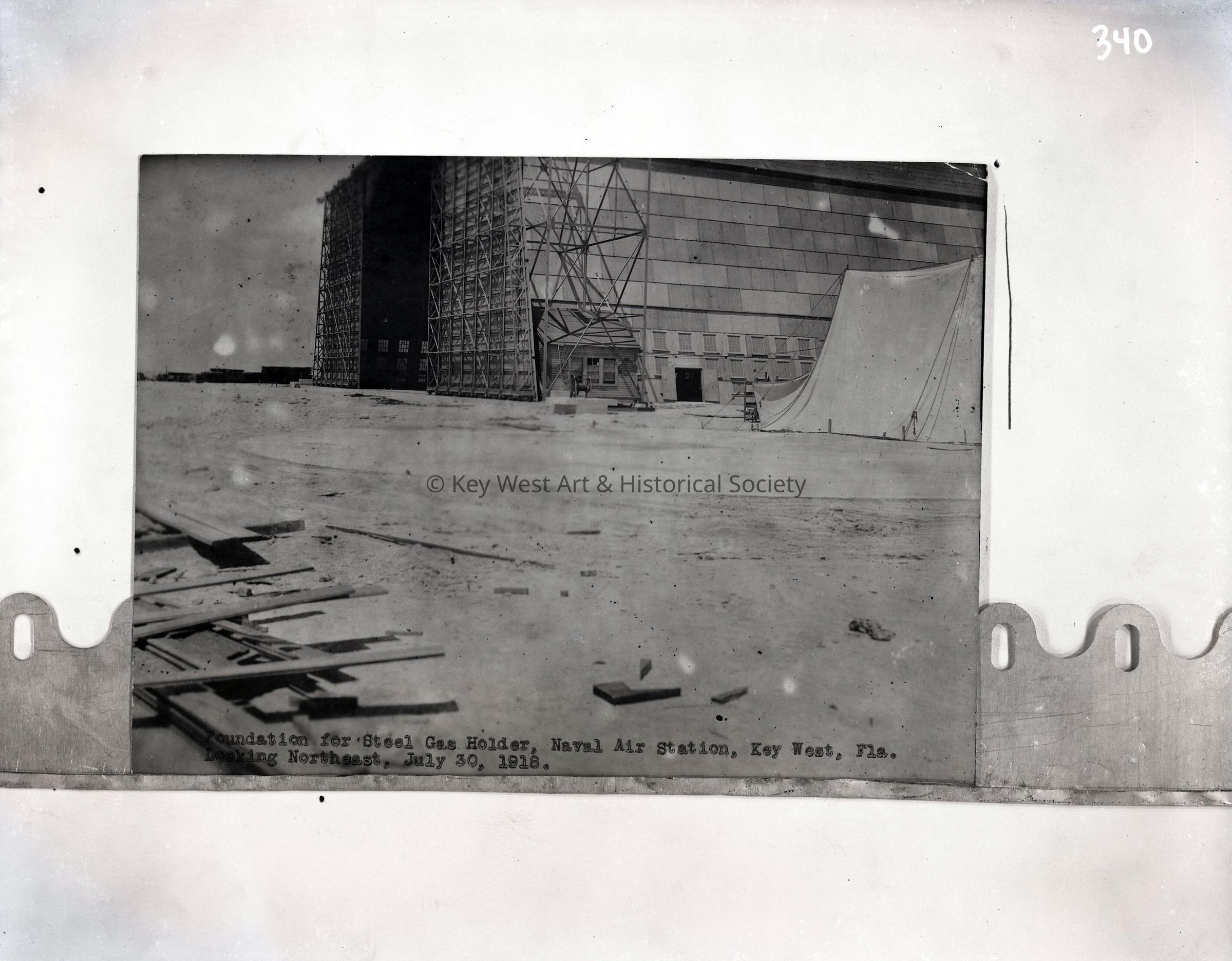 Black and white negative of showing the foundation for the steel gas holder at the Naval Air Station Key West's blimp hanger.