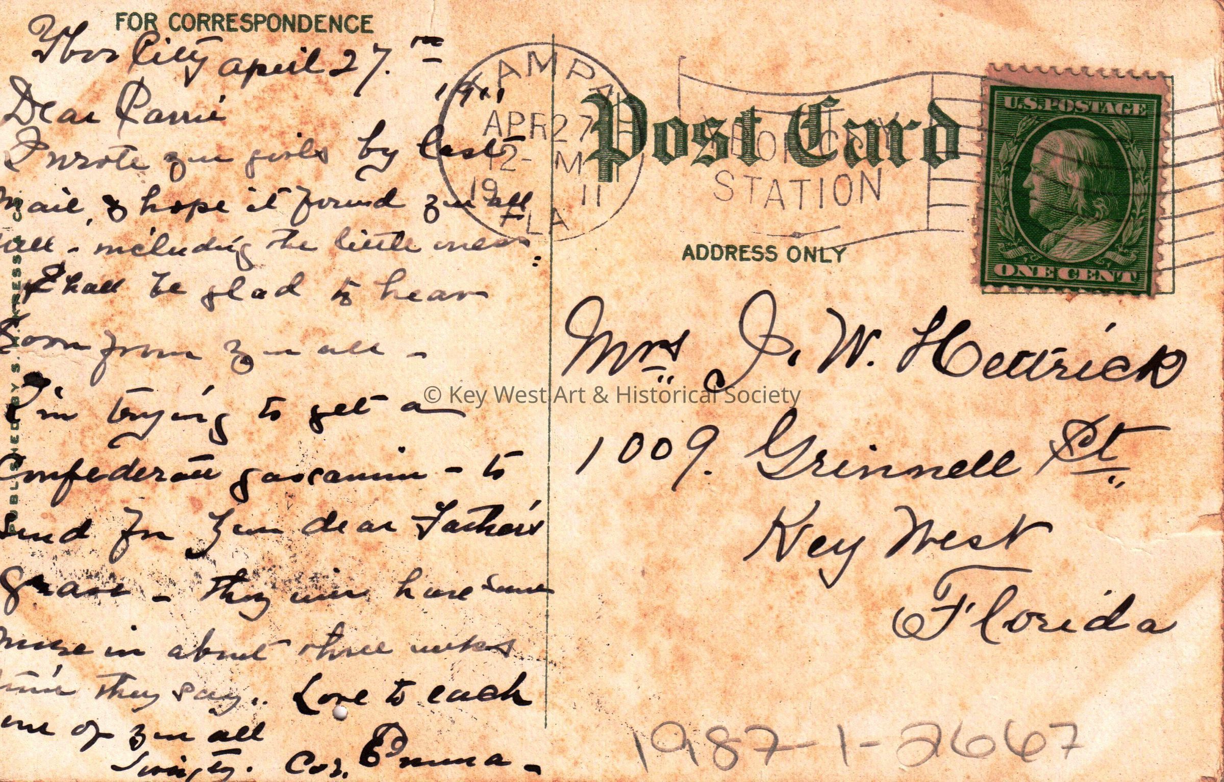 Postcard depicting an ornate fountain. The caption reads, ‘Fountain at entrance to Tampa Bay Hotel, Tampa, Florida’. The message on the verso reads, ‘Ybor City, April 27, 1911, Dear Carrie, I wrote you posts by last mail. I hope it forward you all ___ - including the little ones. Shall be glad to hear some for you all. I am trying to get a Confederate ___ to send for your dear father’s grave. They were here ___ in about three weeks ___ they say. Love to each one of you all, Lovingly, Cousin ___’. The card is addressed to Mrs. J. W. Hattrick, 1009 Grinnell Street, Key West, Florida, and is postmarked Tampa, April 27, 1911.Subject Place