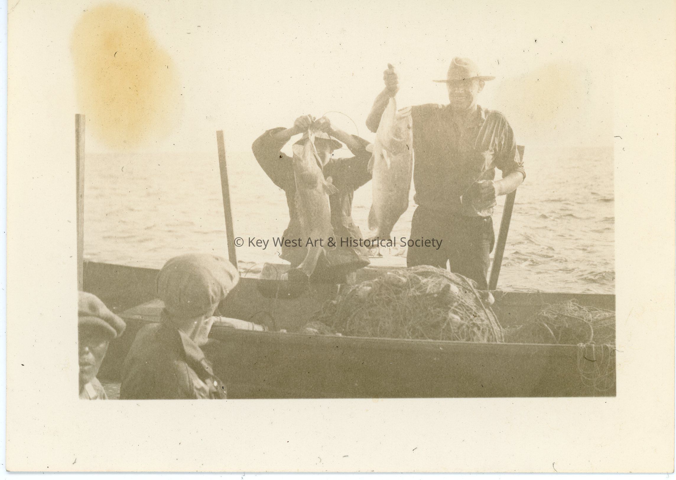 Black and white photograph of three men on the water with netting. Two men are standing in the center of the image and holding up fish. The photo was part of a photograph album began by Victor H. Baker in 1940.