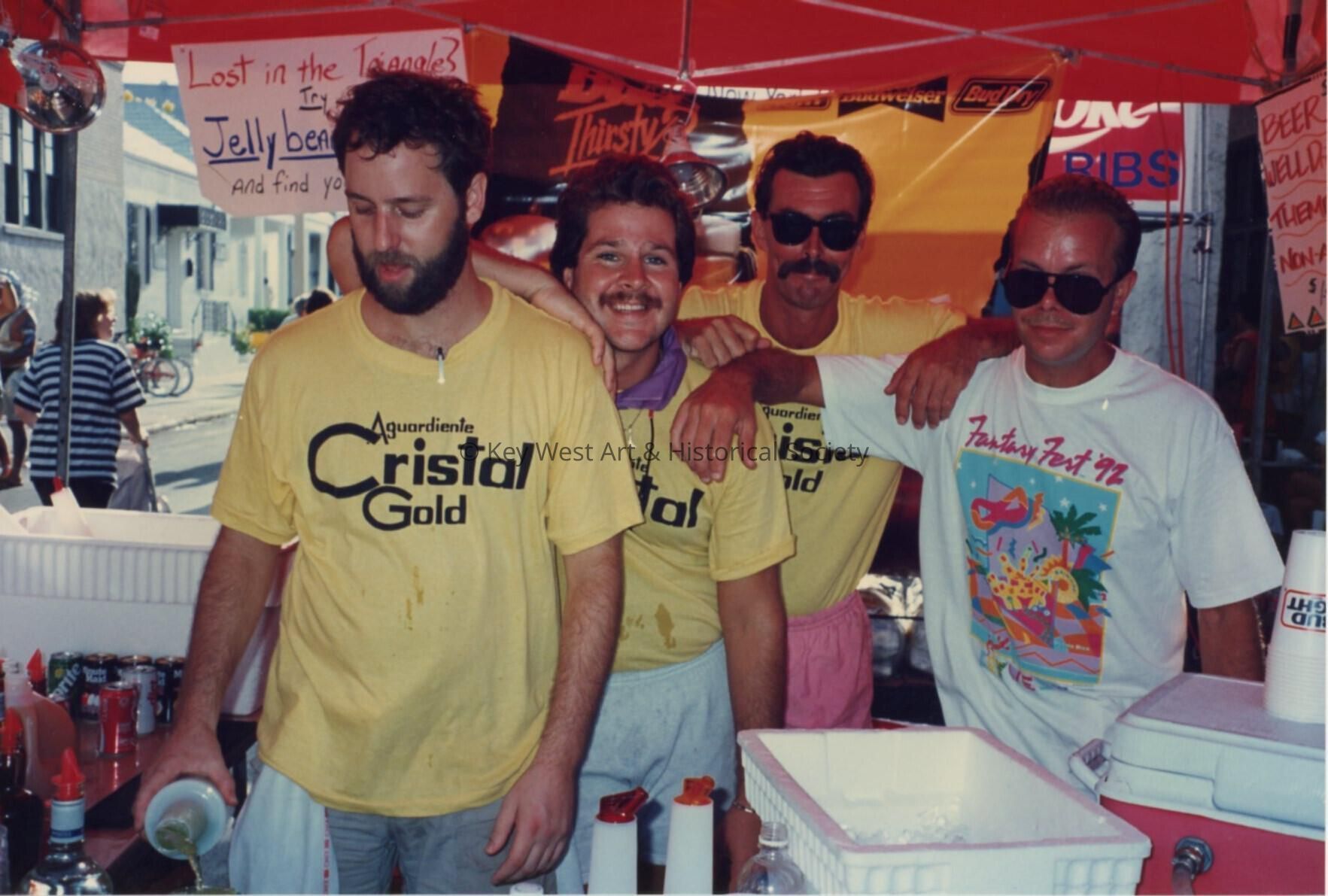 Four unknown men working at the Cristal gold booth.Entry/Object ID