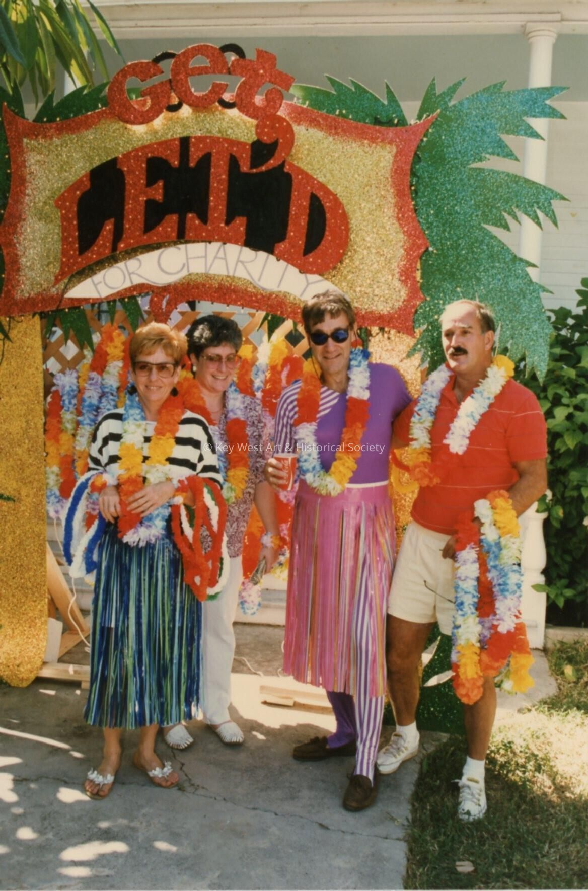 Four unknown people dressed up standing in front of a float.Collection