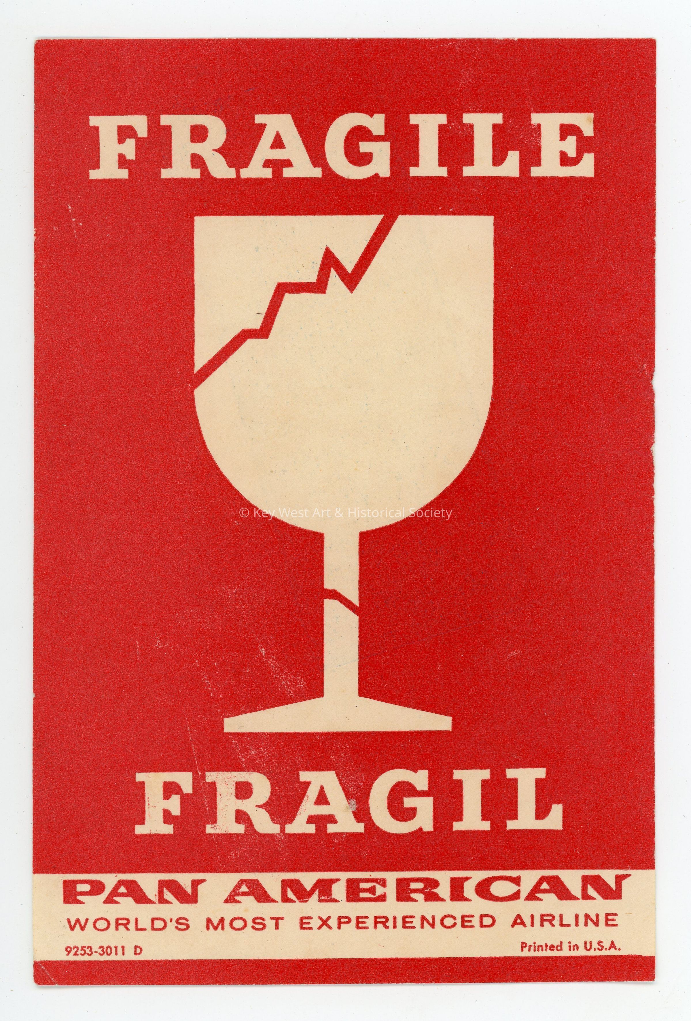 A red and white 'Fragile' sticker for Pan American World Airways. In the center of the sticker is a white outline of a broken wine glass. Presumably this sticker would be used for luggage.Collection