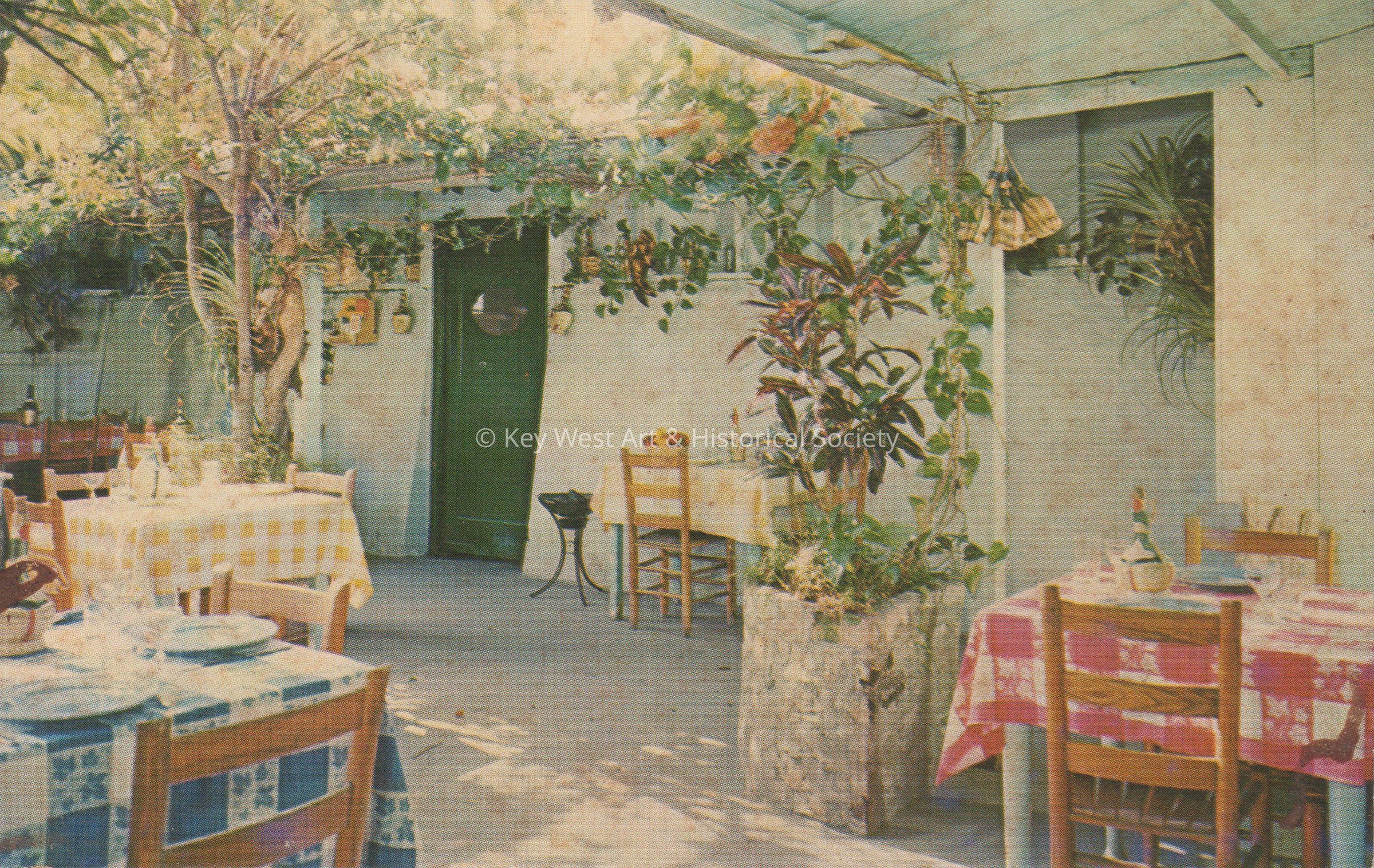Postcard of restaurant tables on a patio. The description on the verso reads, ‘Francesco’s El Patio Continental Restaurant, Corner Duval & Green Streets, Key West, Florida. Specializing – Italian, Spanish, French, Seafood and local dishes. Closed on Sunday, imported Spanish & Italian Wines.’Subject Place