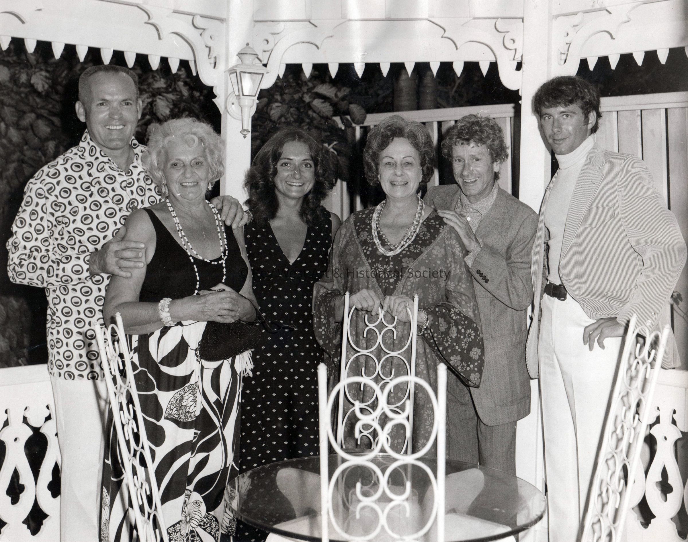 Black and white photograph of (l-r) Frank Fortis, Rose Fiscus, unknown woman, Margo Golan, possibly Henry Faulkner and an unknown man in Tennessee Williams' gazebo. The gazebo is located on the grounds of his 1431 Duncan Street home.Photograph Details