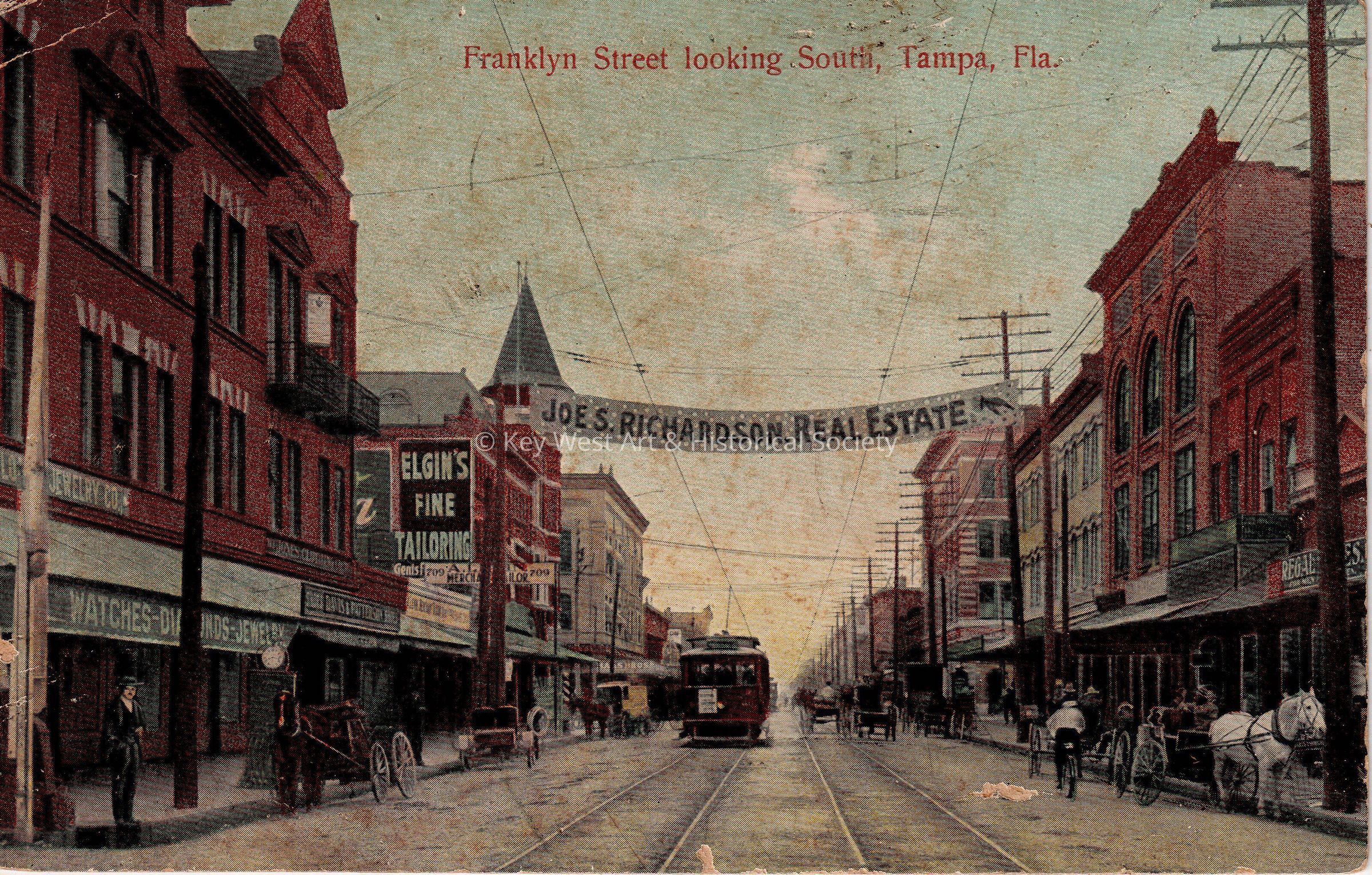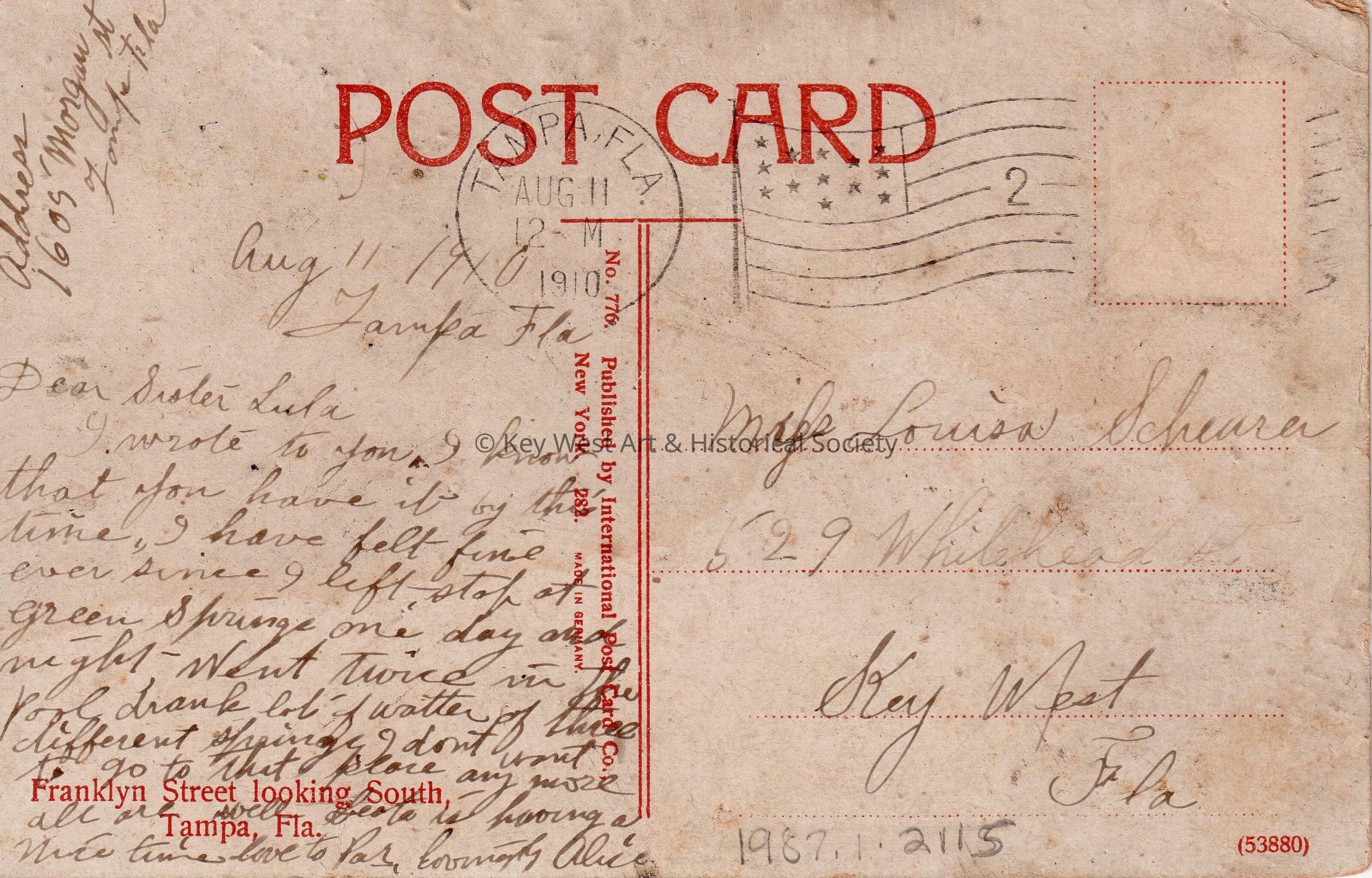Postcard depicting a city street with a banner spanning the street that reads, ‘Joe S. Richardson Real Estate’, and store signs that read, ‘Elgin’s Fine Tailoring and Watches, Diamonds, Jewelry’. The caption reads, ‘Franklyn Street looking South, Tampa, Florida.’ The message on the verso reads, ‘Address 1605 Morgan Street, Tampa, Florida, August 11, 1910, Tampa, Florida, Dear Sister Lula, I wrote to you. I know that you have it by this time. I have felt fine ever since I left. Stop at Green Springs one day and night, went twice in the pool, drank lots of water of three different springs. I don’t want to go to that place anymore. All are well. Having a nice time. Love to Pa, Lovingly Alice.’ The card is addressed to Louisa Scheurer, 529 Whitehead Street, Key West, Florida, and is postmarked Tampa, August 11, 1910.Subject Place