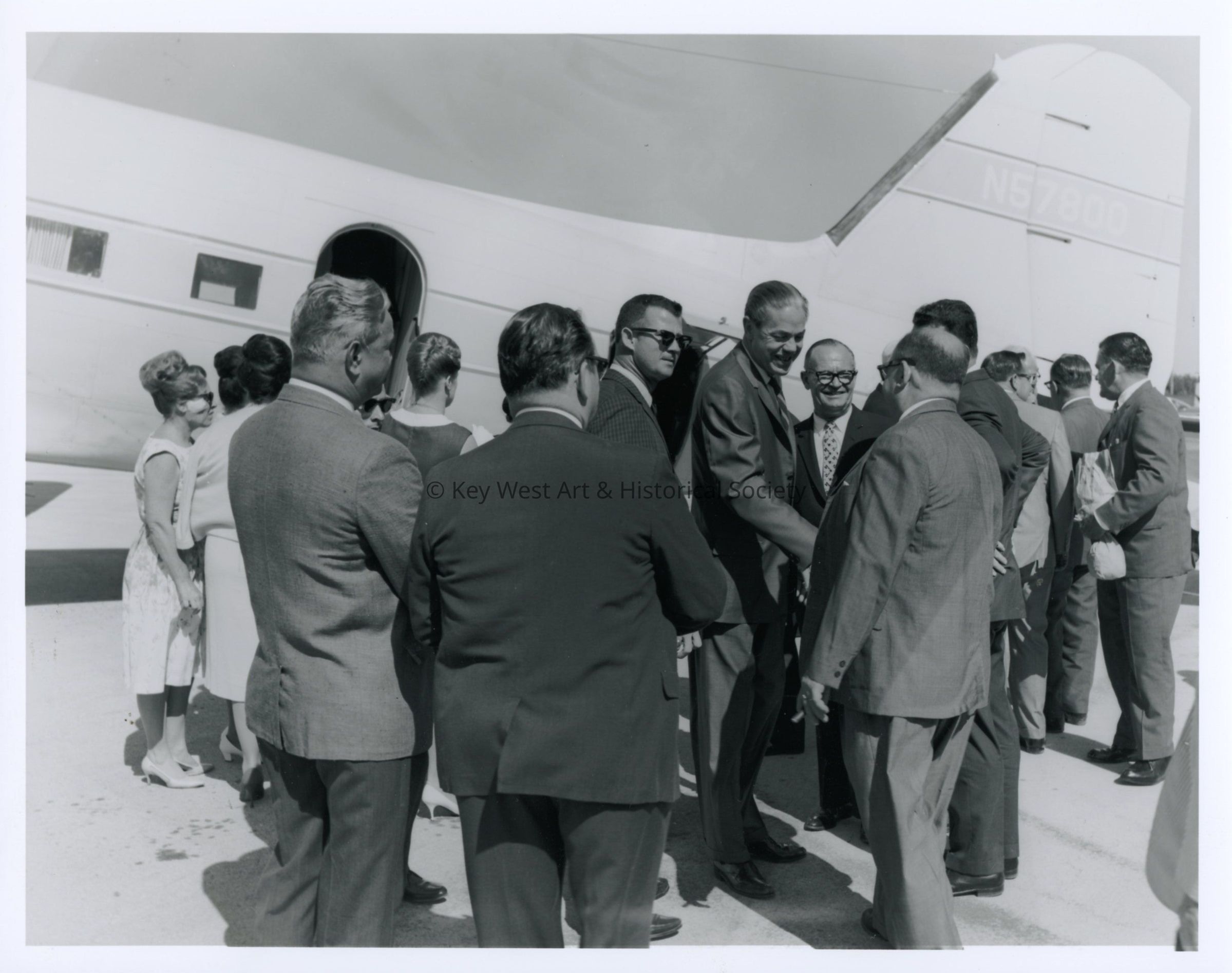 Black and white photograph of officials shaking hands on the tarmac during the 1966 "Freedom Flights".