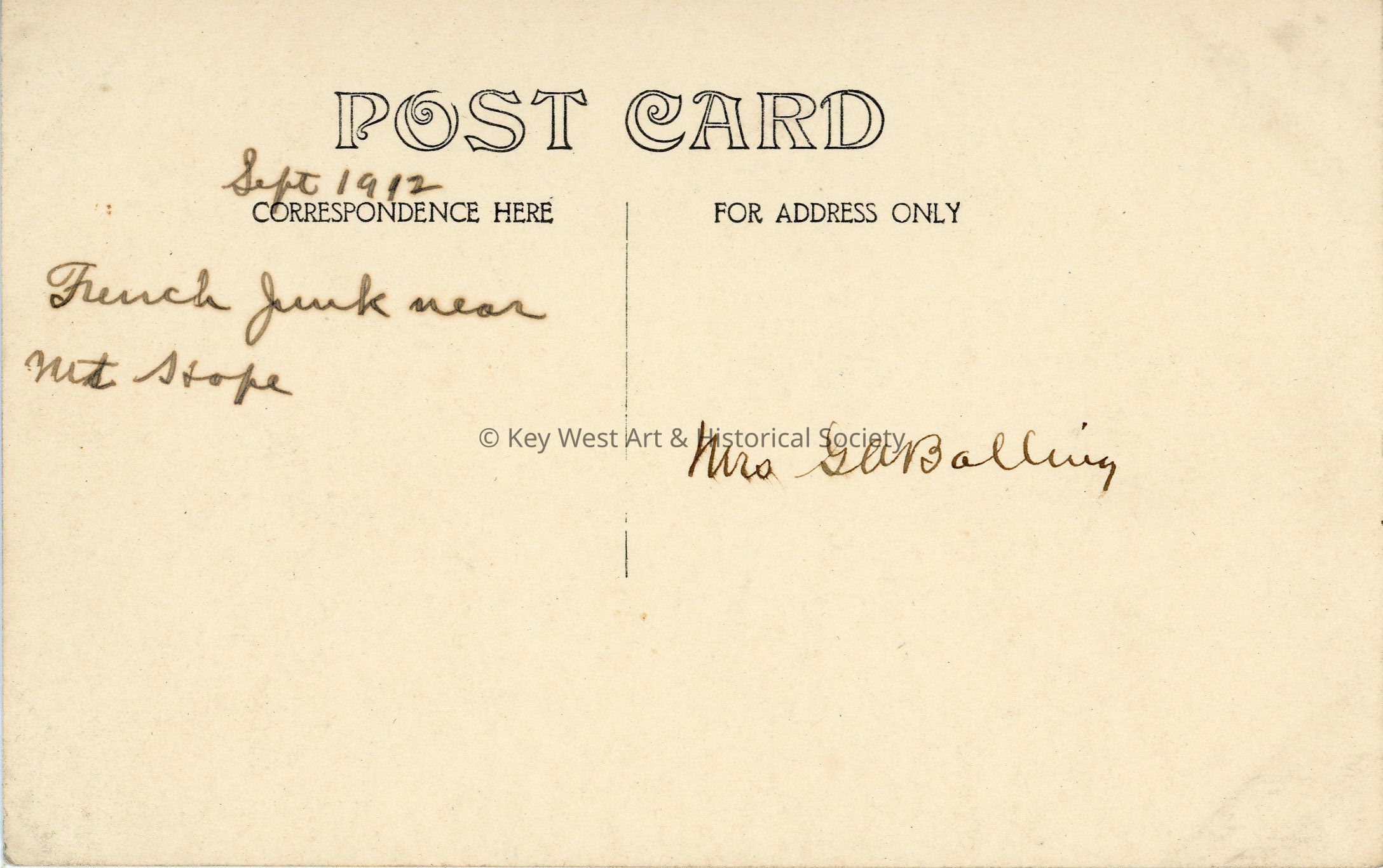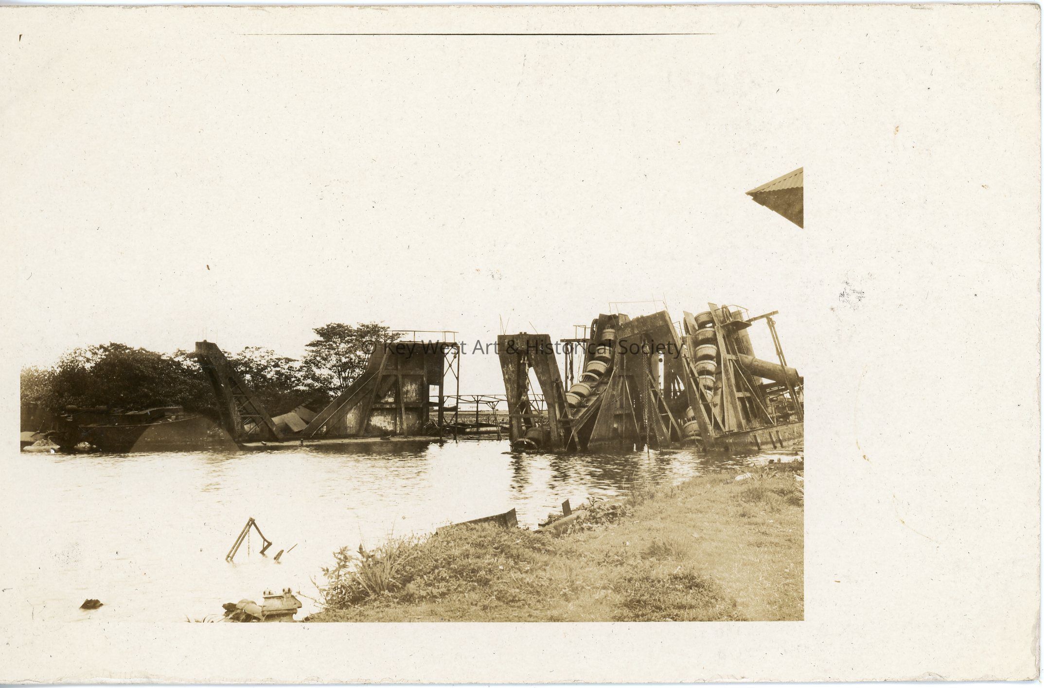 Black and white photograph postcard depicting junked French dredging machinery that is in a river. The postcard is dated September 1912 and is addressed to Mrs. G.A. Balling. Verso has a handwritten note.