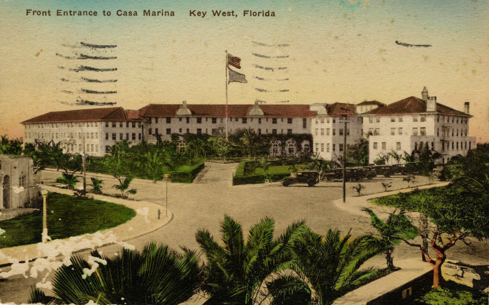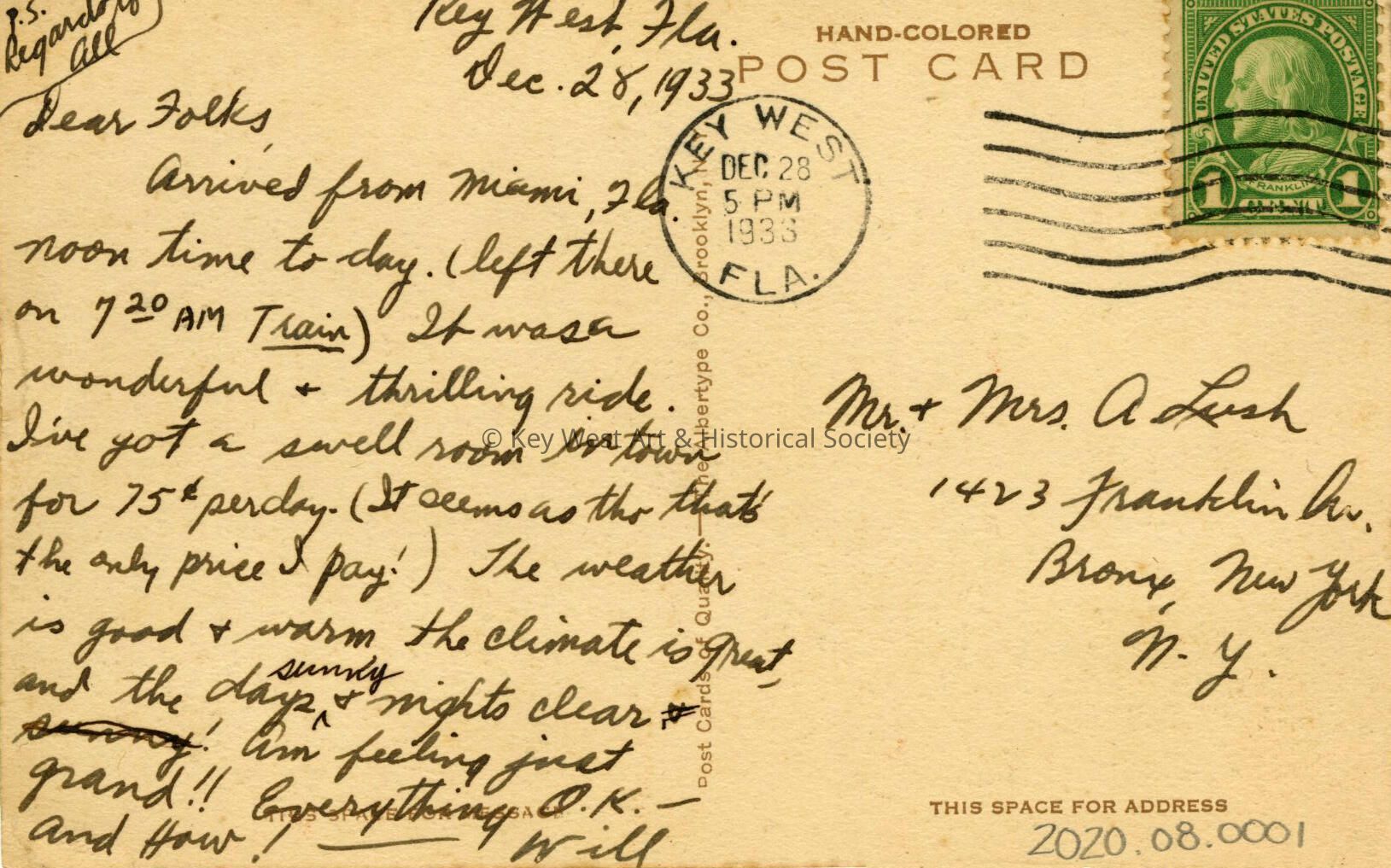 Postcard depicting the Casa Marina Hotel. The caption reads, ‘Front Entrance to Casa Marina. Key West, Florida.’ The message on the verso reads, ‘Dear Folks, Arrived from Miami, Fla. noon time to-day. (left there on 7:20AM train) It was a wonderful & thrilling ride. I've got a swell room in town for 75¢ per day. (It seems as tho that's the only price I pay!) The weather is good & warm the climate is great, and the days sunny & nights clear. Am feeling just grand!! Everything O.K. and how! Will’ The card is addressed to Mr. & Mrs. A. Lush, 1423 Franklin Ave, Bronx, New York, NY and is postmarked Key West, December 28, 1933.Subject