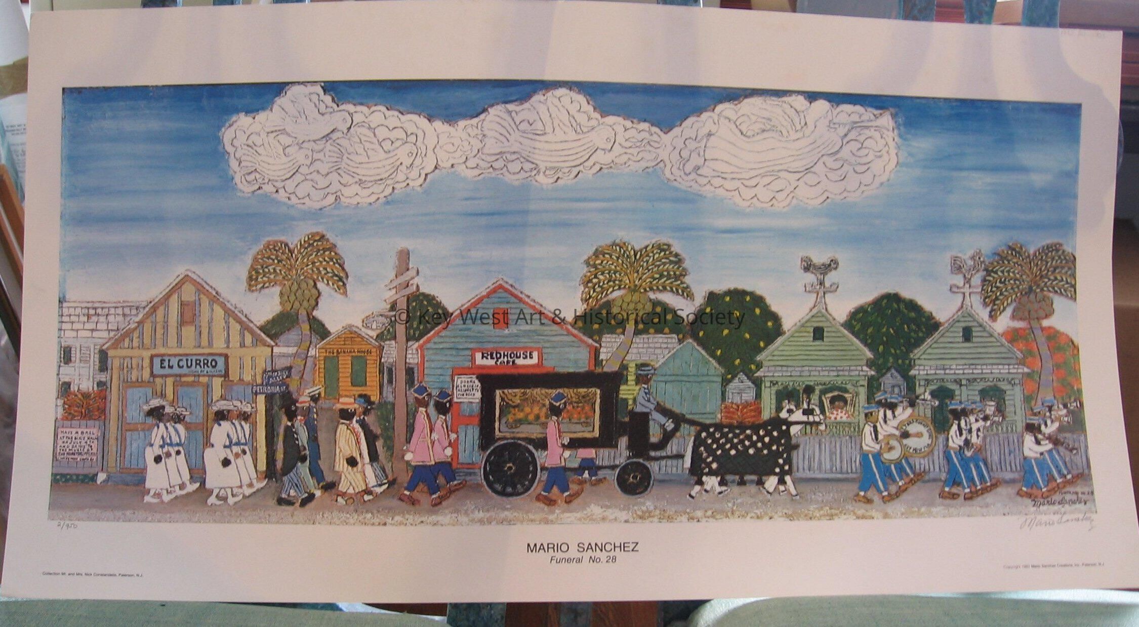 Print in color. Number 2 of 950, signed and stamped in lower right corner. Print is of Sanchez piece titled Funeral No. 28. Street scene of a funeral march going down the street. A band leads the funeral procession followed by a horse drawn hearse, with the mourners following last. The funeral is passing in front of El Curro Signs, Red House Café, and some houses.Type of Print