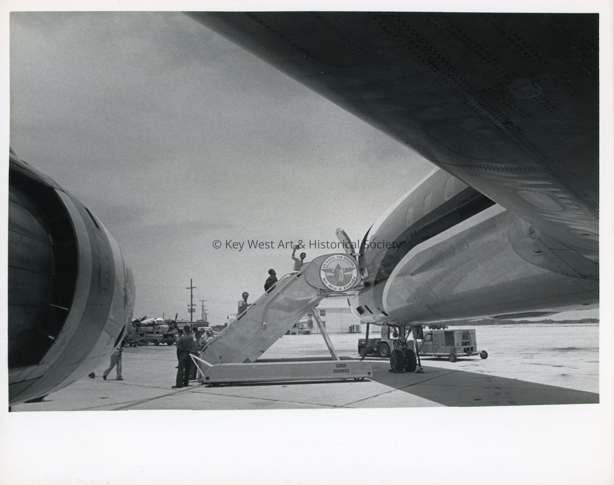 Black and white photograph of Cuban refugees boarding a plane to be receive further processing at Eglin Air Force Base.
