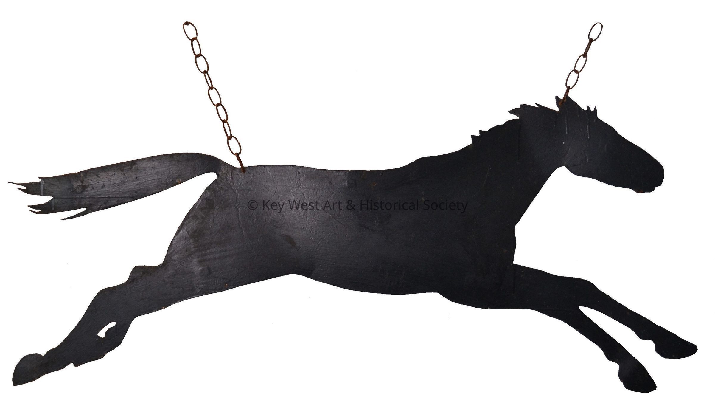 Black painted metal sign of a running horse hung from chains. The galloping horse was the stack emblem from the CURB, the last major salvage vessel in Key West belonging to the Merritt, Chapman and Scott wrecking company.Collection
