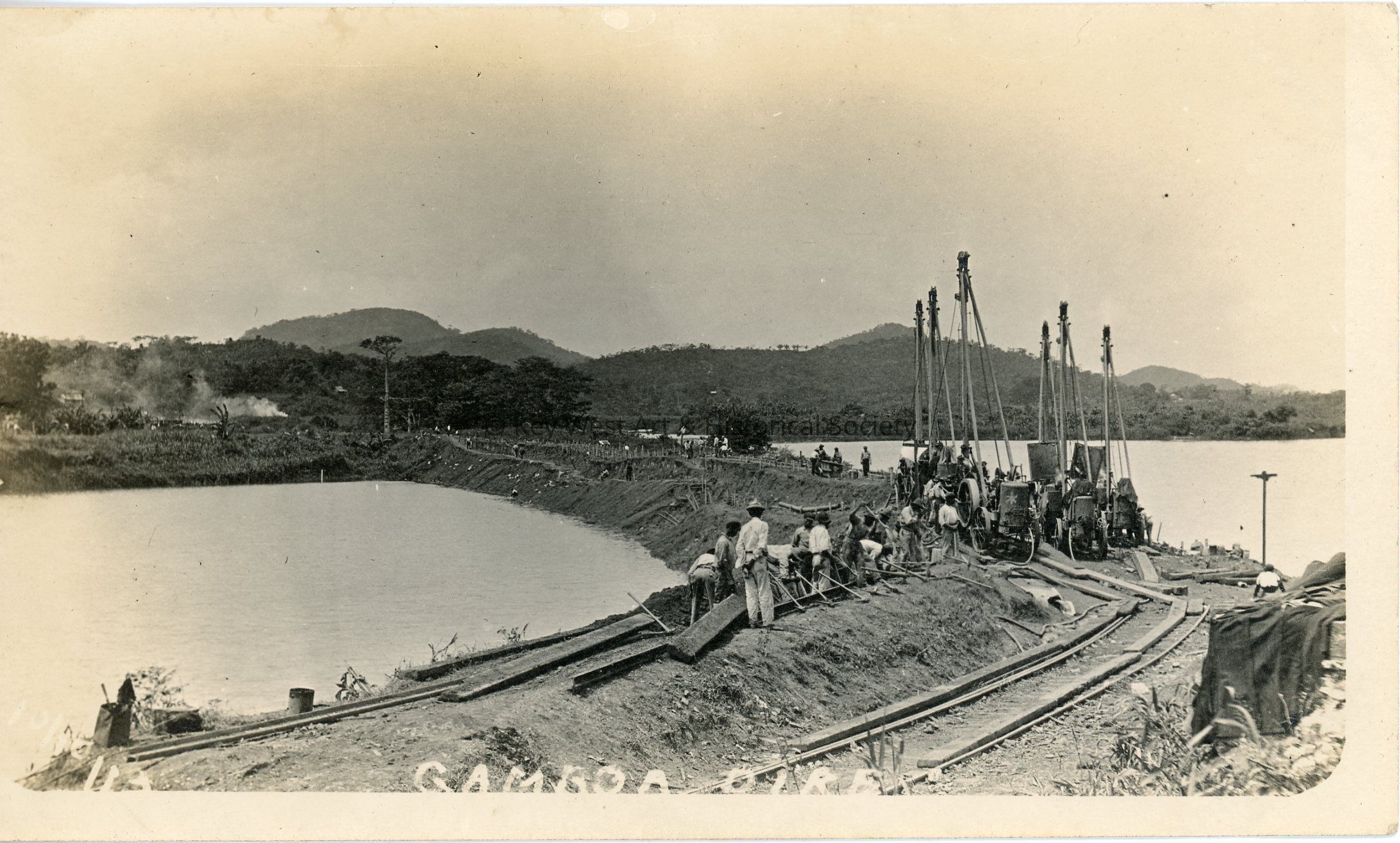 Black and white photograph depicting men working on a thin strip of land between two bodies of water. Text below the image reads 'Gamboa Dike.' The image is dated October 10, 1913. The photograph was designed to be attached to a postcard backing.