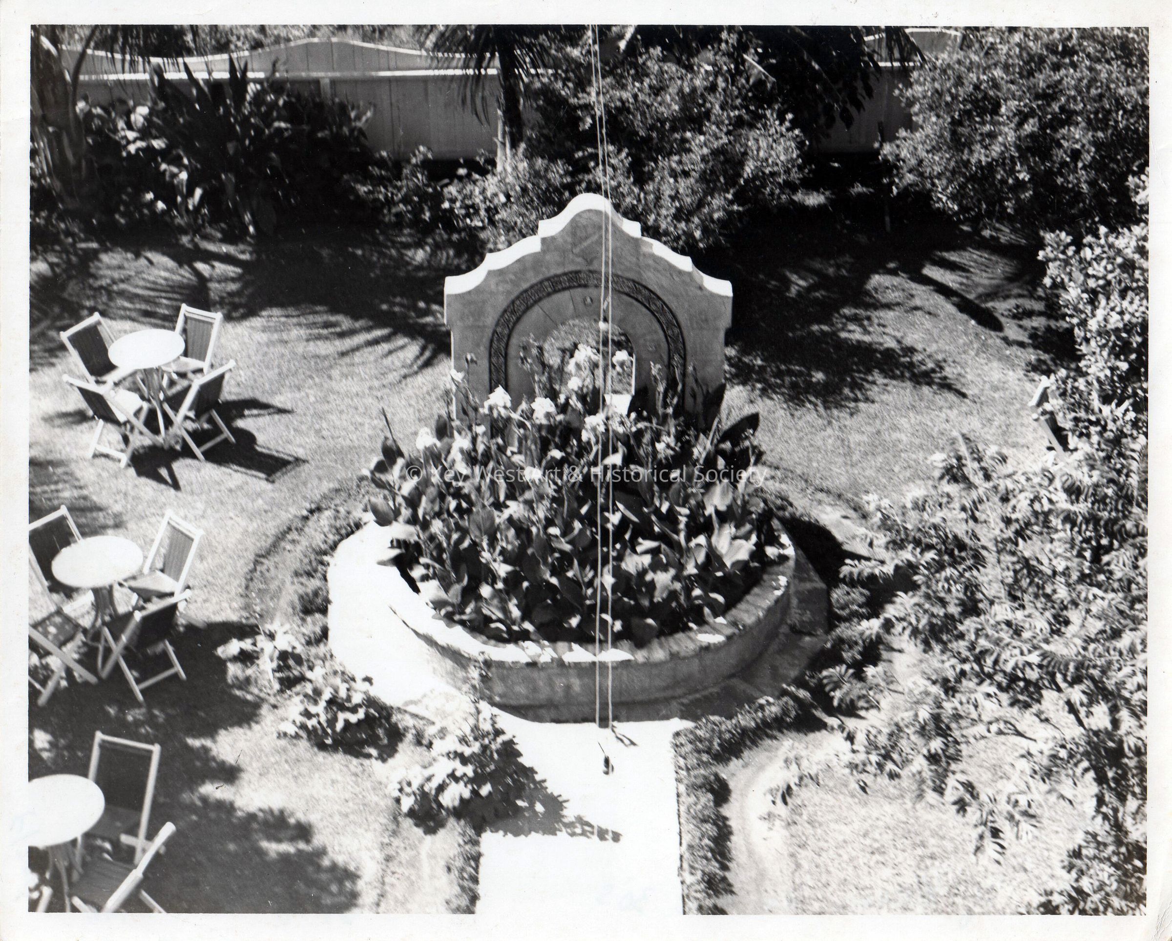 Black and white photograph of the garden at Pena's Garden of Roses bar and restaurant on the 500 block of Thomas Street before World War II.