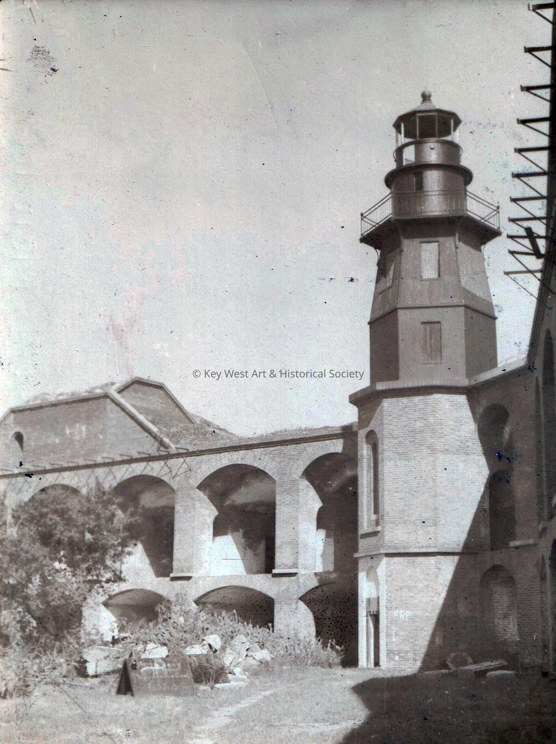 Black and white photograph of the Garden Key Lighthouse at Fort Jefferson in the Dry Tortugas.