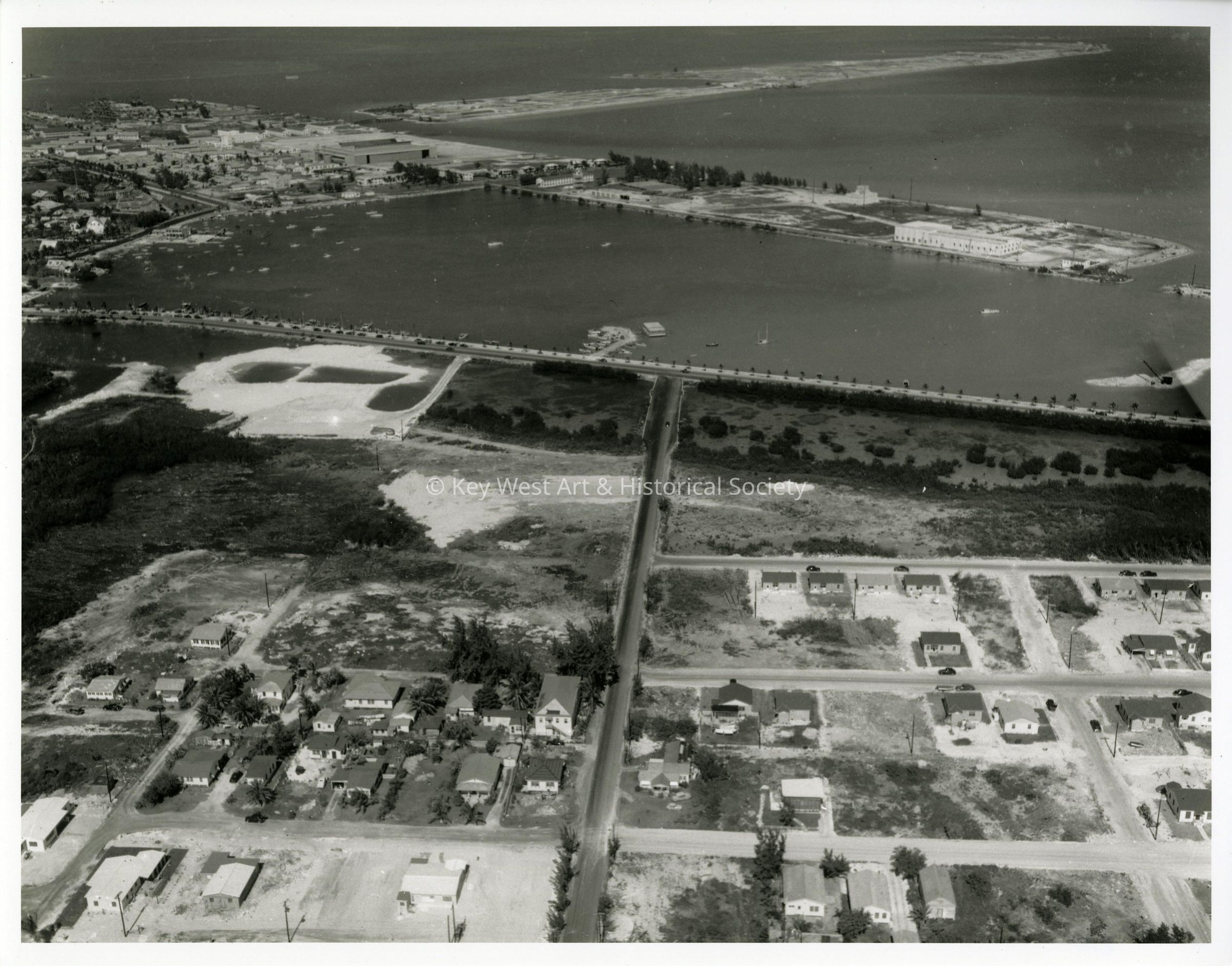 Black and white photograph of Garrison Bight with North Roosevelt Boulevard in the foreground and Trumbo Point in the background.
