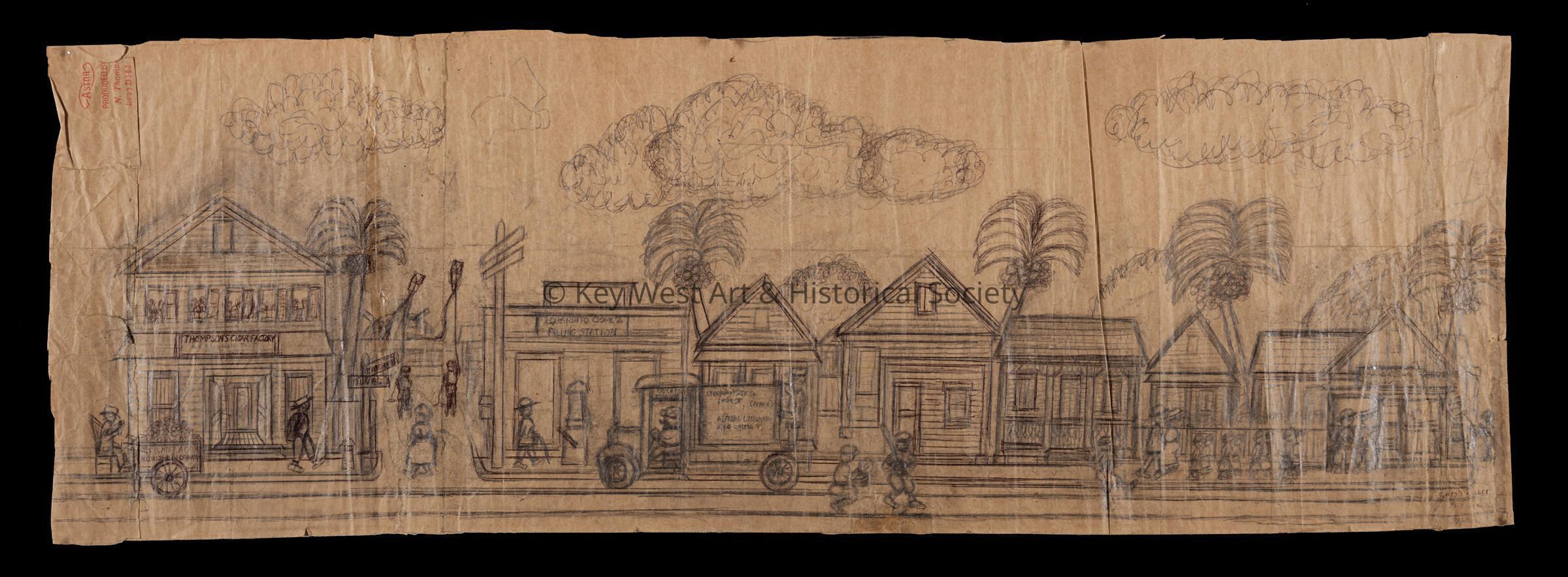 Pencil sketch on an unfolded paper bag by Mario Sanchez depicting Gato's Village; a scene along Duval Street at it's intersection with Catherine Street. Thompson's Cigar Factory is seen on the left while children play baseball in the street.Type of Drawing