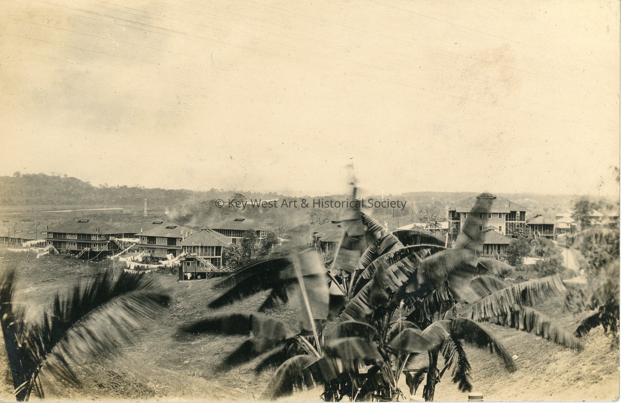 I took this picture from the front steps of our quarters looking toward Colon and the mouth of canal which you can see, also the ocean, the banana trees take up most of the picture the ground is all covered with grass but you can not tell it from the picture you can see we wear clothe by the washing on the lineLanguage