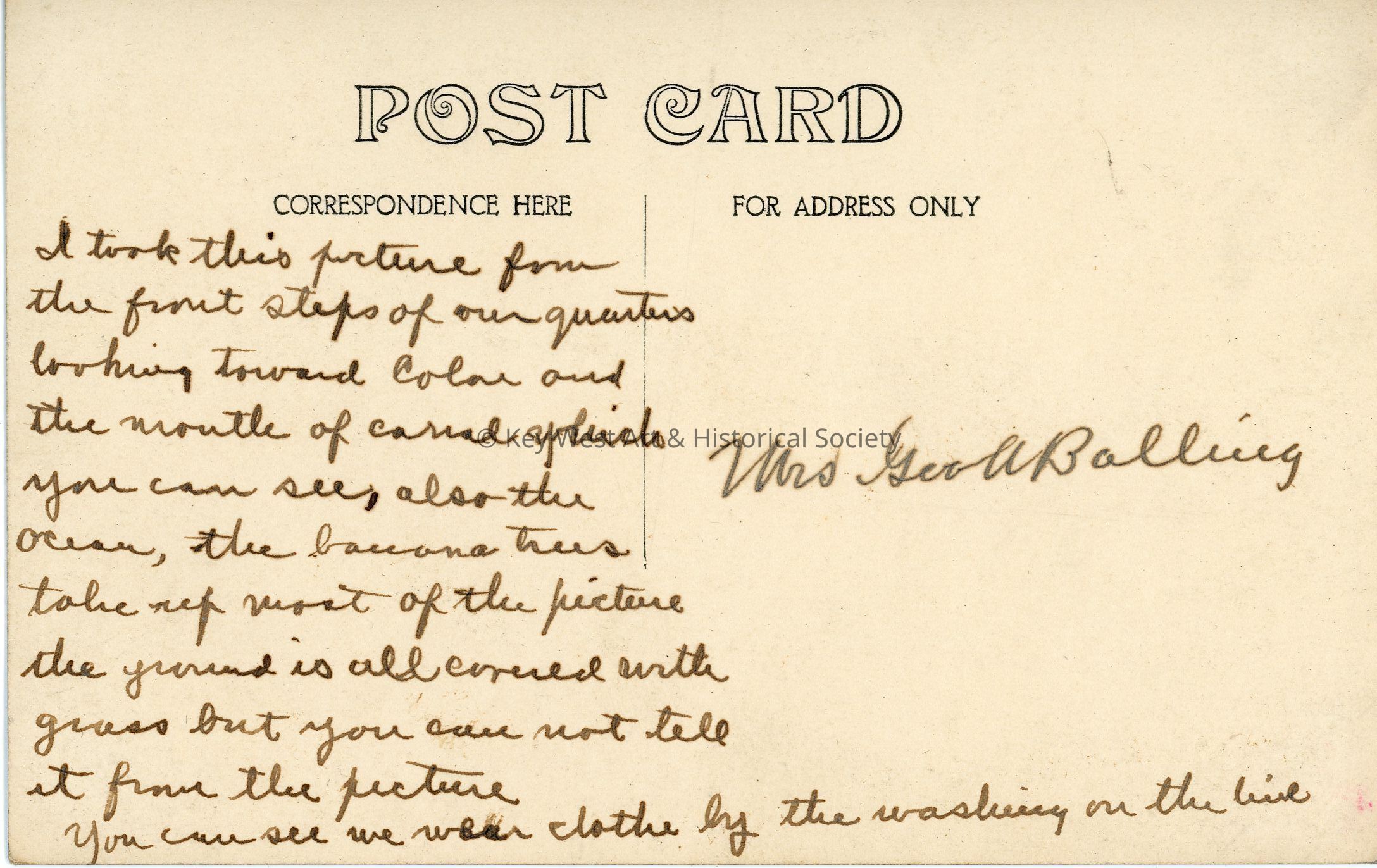 Black and white photograph postcard depicting banana trees with housing quarters and full clotheslines in the background. The postcard is addressed to Mrs. Geo. A. Balling.Subject