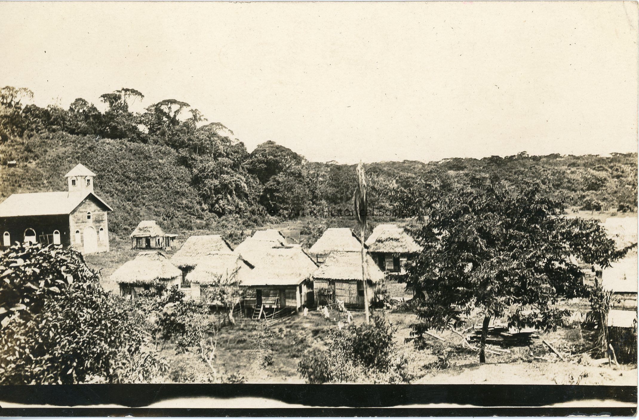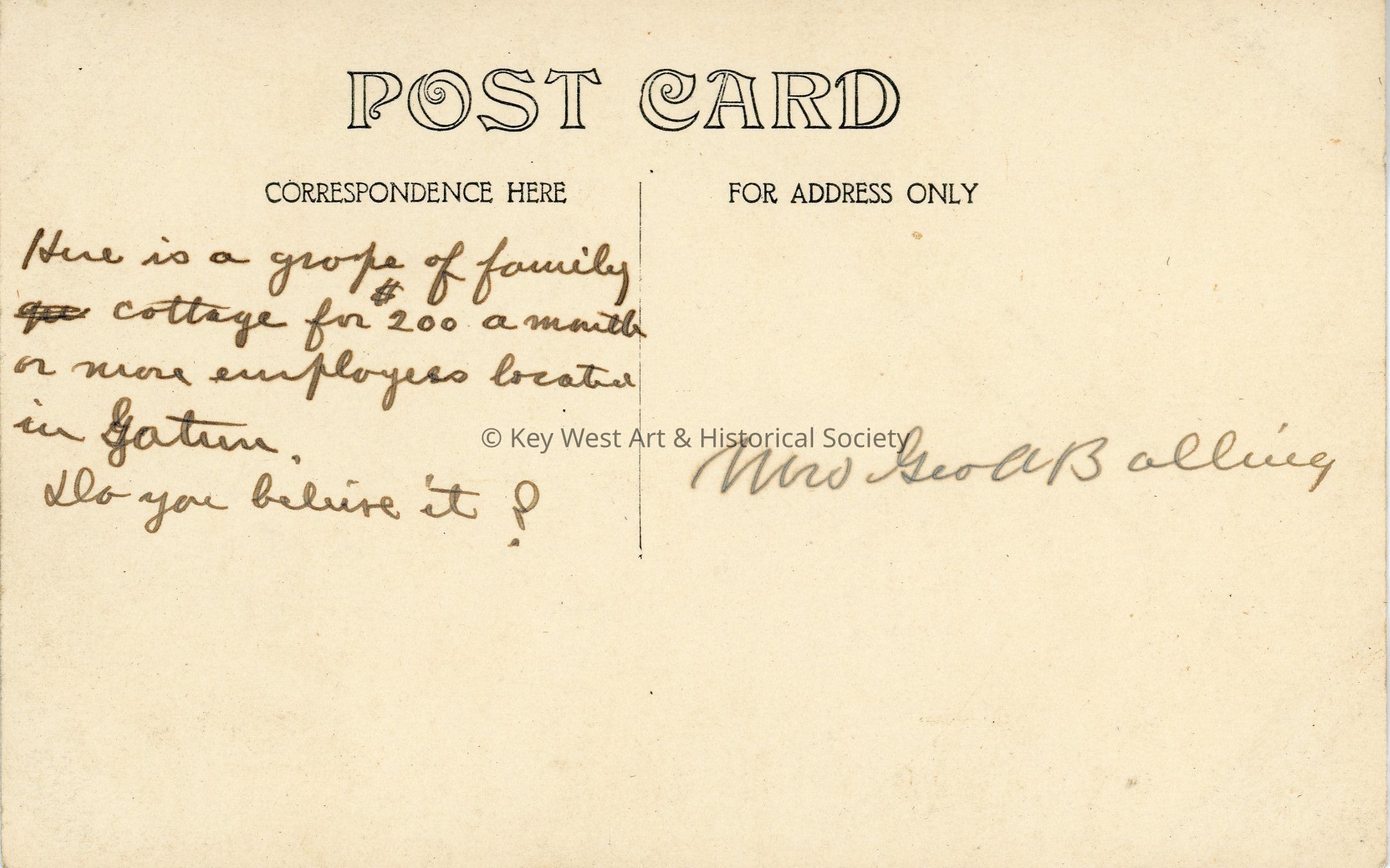 Black and white photograph postcard ostensibly depicting family quarters in Gatun. A church can be seen to the left. Postcard is addressed to Mrs. Geo. A. Balling. Verso has a handwritten note.Subject