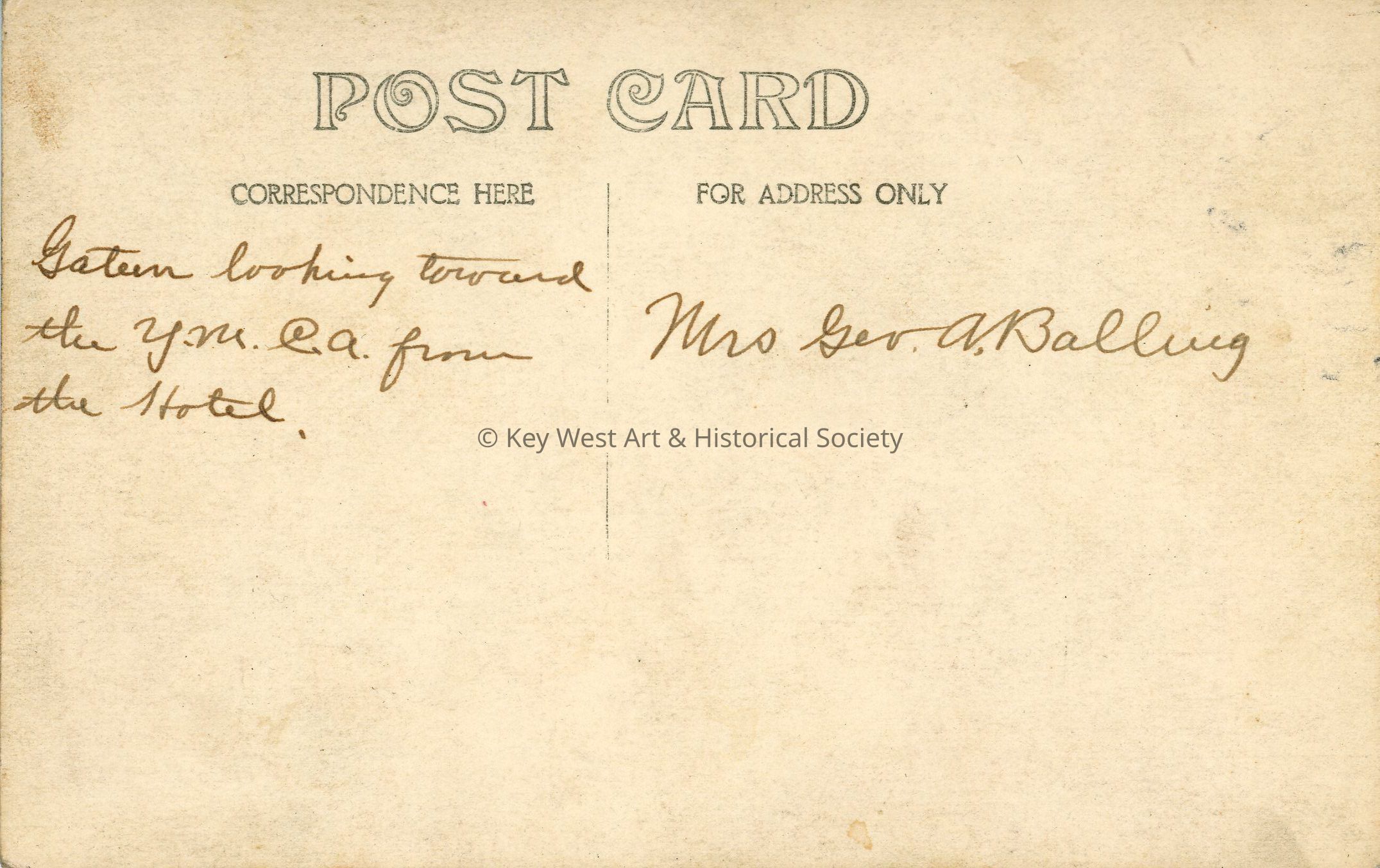 Black and white photograph postcard depicting the town of Gatun. The photo shows housing and the Y.M.C.A. can be seen in the background. The postcard is addressed to Mrs. Geo. A. Balling. Verso has a handwritten note.