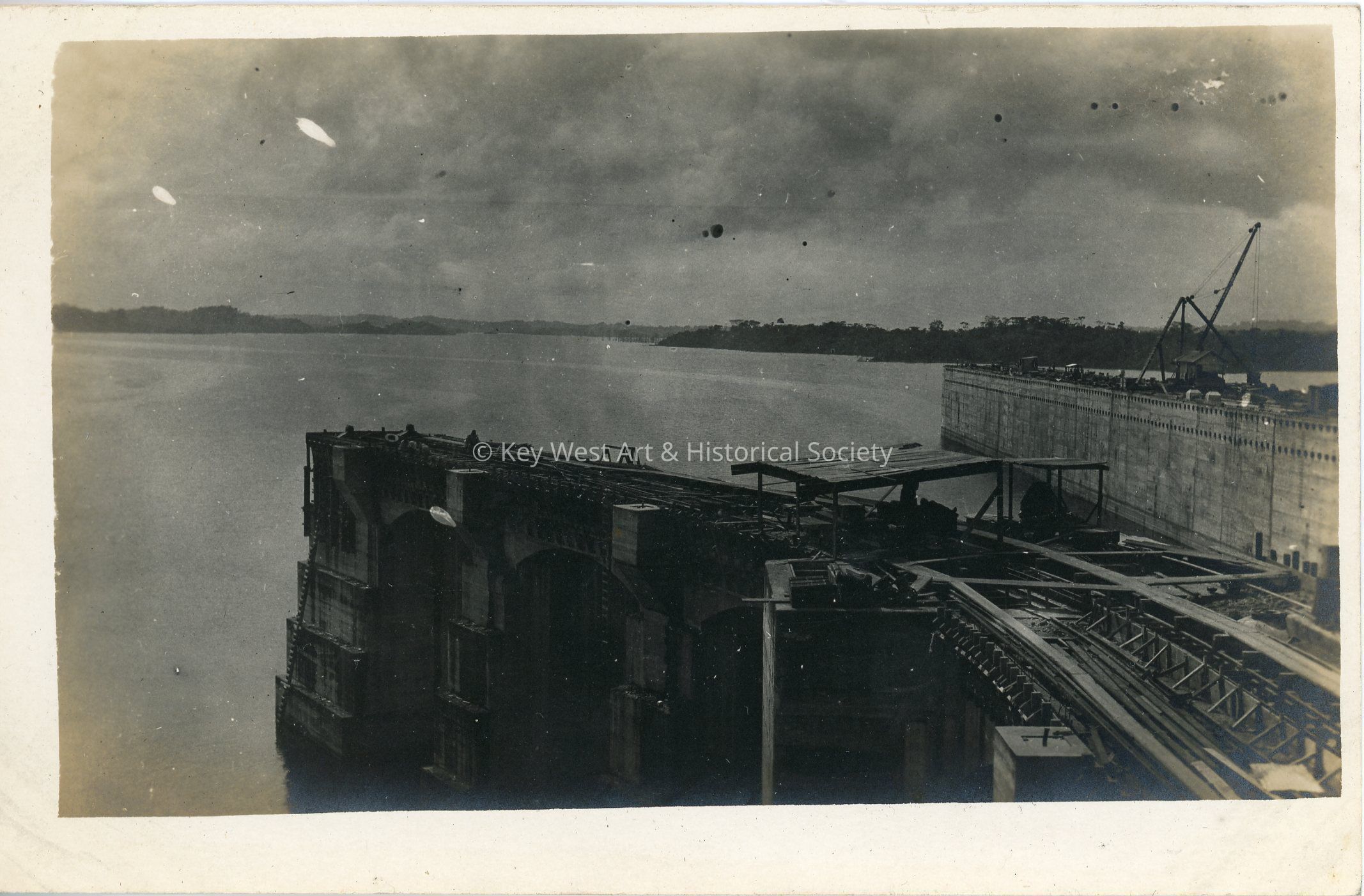 Black and white photograph postcard depicting the construction of the Panama Canal. The photograph shows Gatun Lake and the center approach wall for the Gatun Locks on the far right. The postcard is addressed to Mrs. G.A. Balling.Subject
