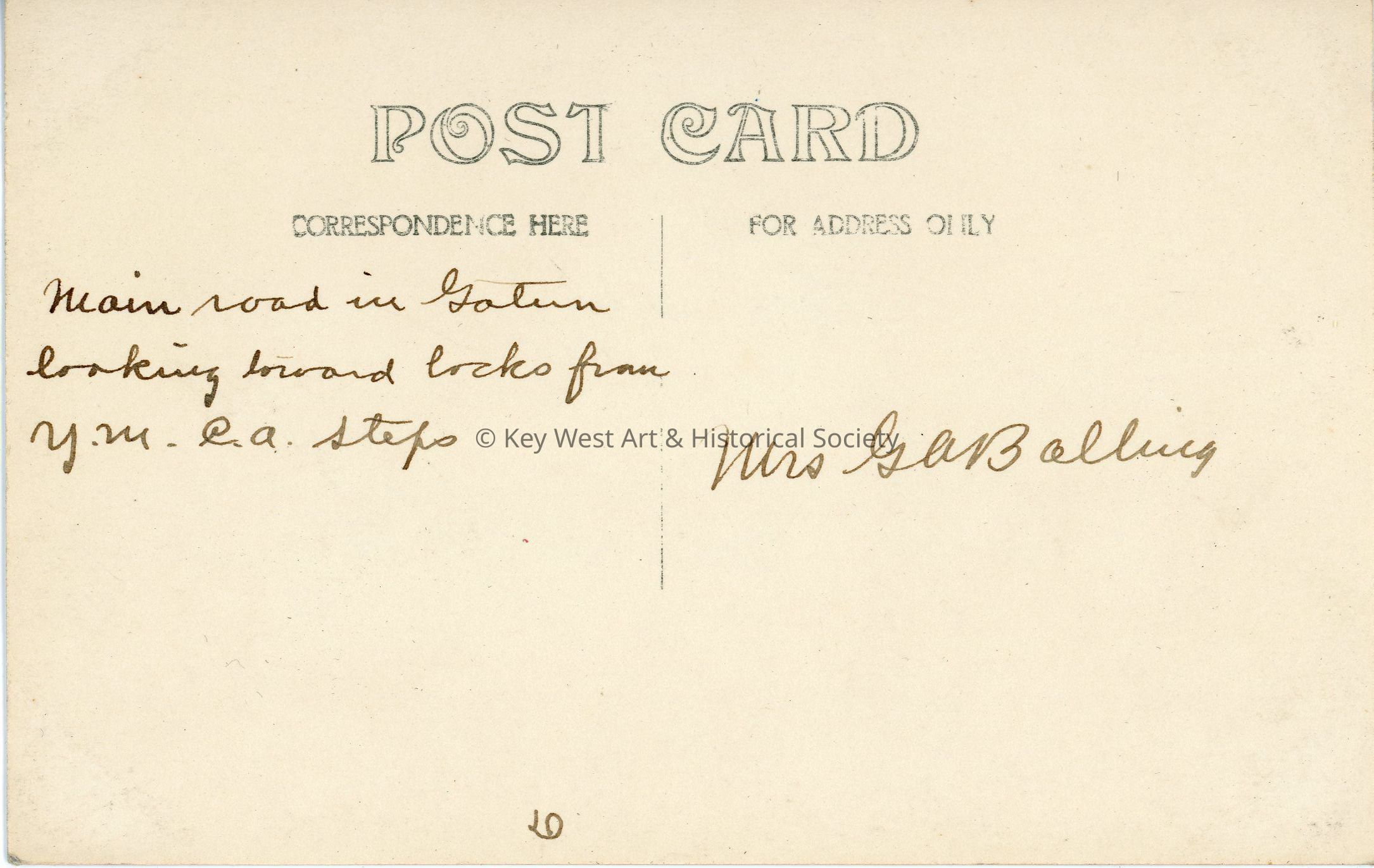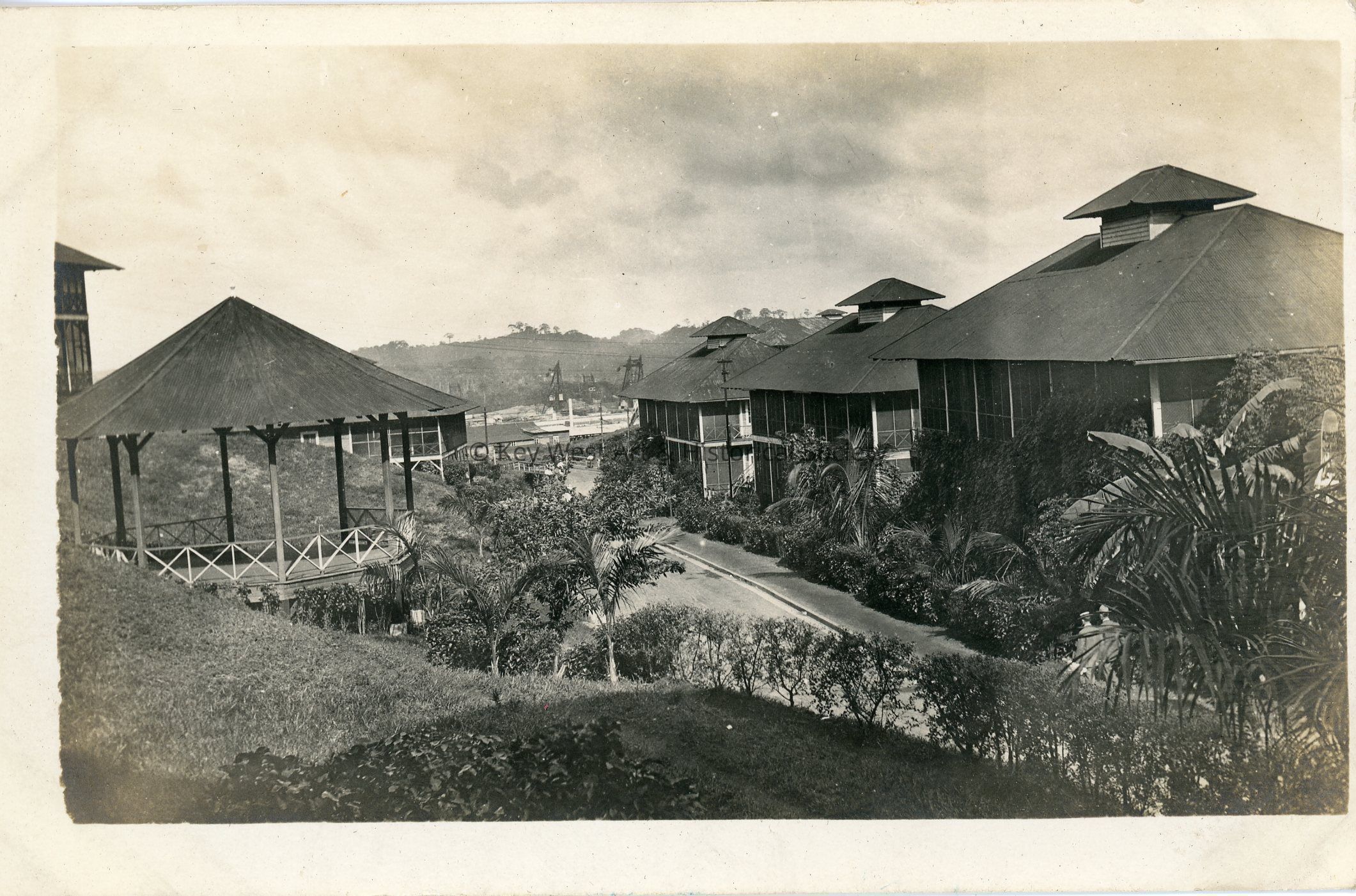 Black and white photograph postcard depicting the main road in the town of Gatun. The Gatun Locks can be seen in the background. The photo shows housing where many workers lived. Verso has a handwritten note.Subject