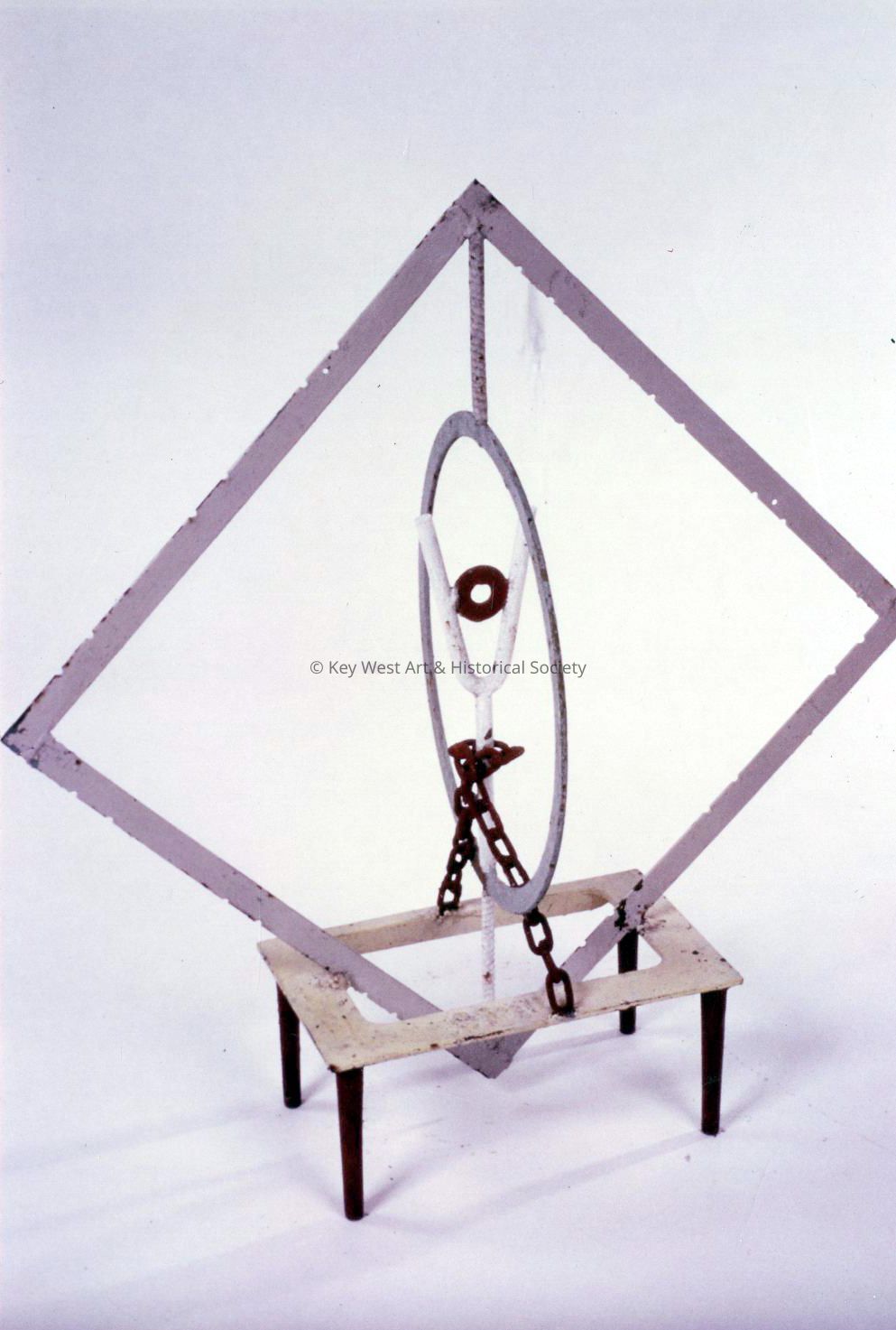 Freestanding sculpture by Stanly Papio depicting intersecting geometric forms suggesting a human head. The lips are ingeniously suggested by two links of a chair that extends down on each side where the ends are anchored to a square frame standing on four legs.Type of Sculpture