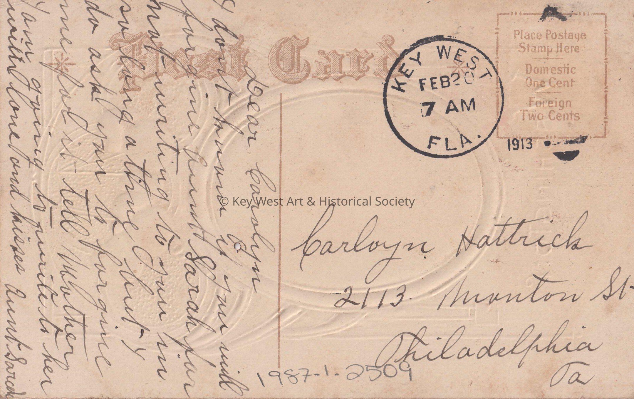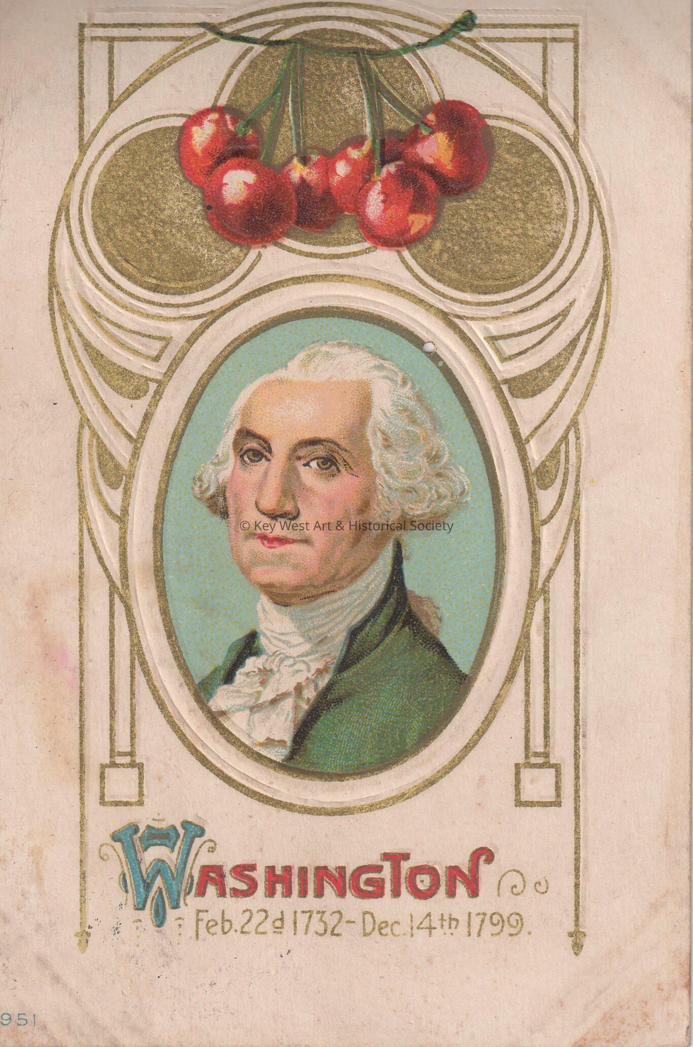 Postcard depicting cherries above a portrait of George Washington. The caption reads, ‘Washington February 22, 1732 – December 14, 1799.’ The message on the verso reads, ‘Dear Carolyn, I don’t know if you will forgive Aunt Sarah for not writing to you in so long a time but I do ask you to forgive me for it – tell Mother I am going to write to her. With love and kisses, Aunt Sarah’. The card is addressed to Carolyn Hattrick, 2113 Manton Street, Philadelphia, Pennsylvania, and is postmarked Key West, February 20, 1913.Collection
