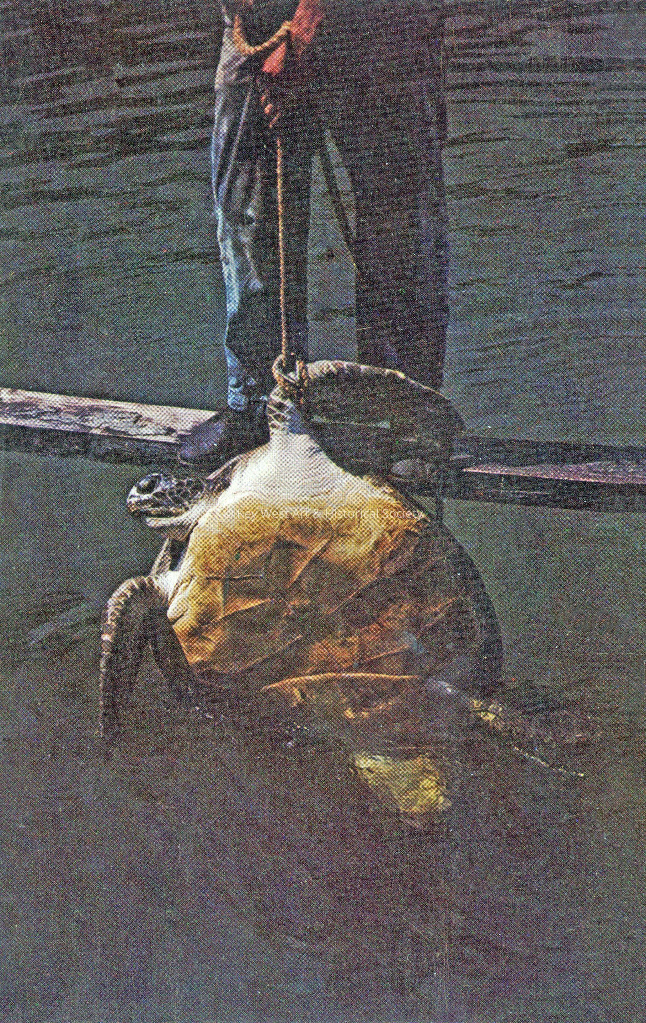 Postcard depicting a man using a rope to pull a large turtle from the water. The description on the verso reads, 'Giant Turtle, Key West, Florida.'Subject Place