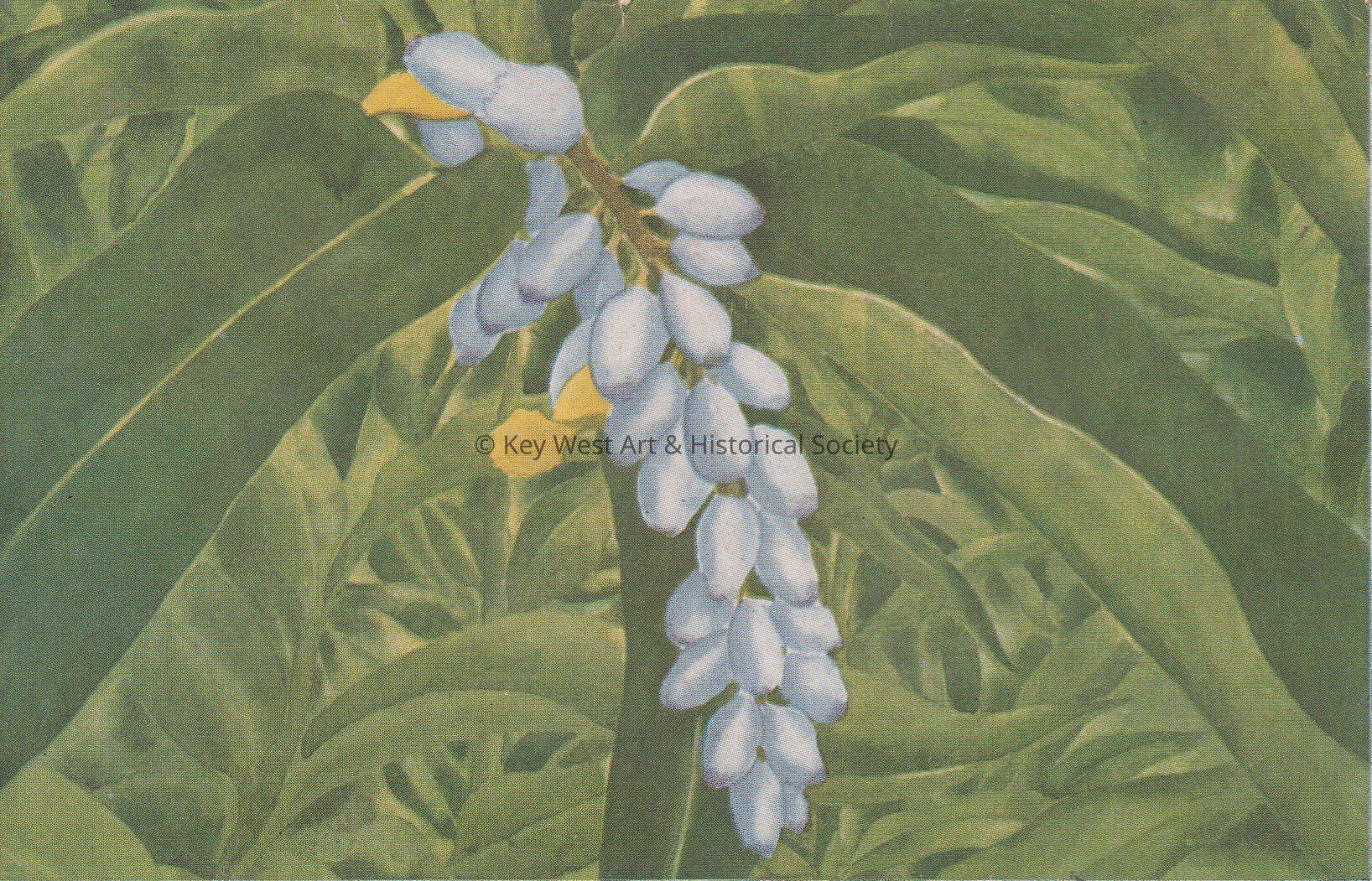 Postcard depicting a painting of a white flower and green leaves. The caption reads, ‘Ginger Plant, Key West, Florida.’Collection