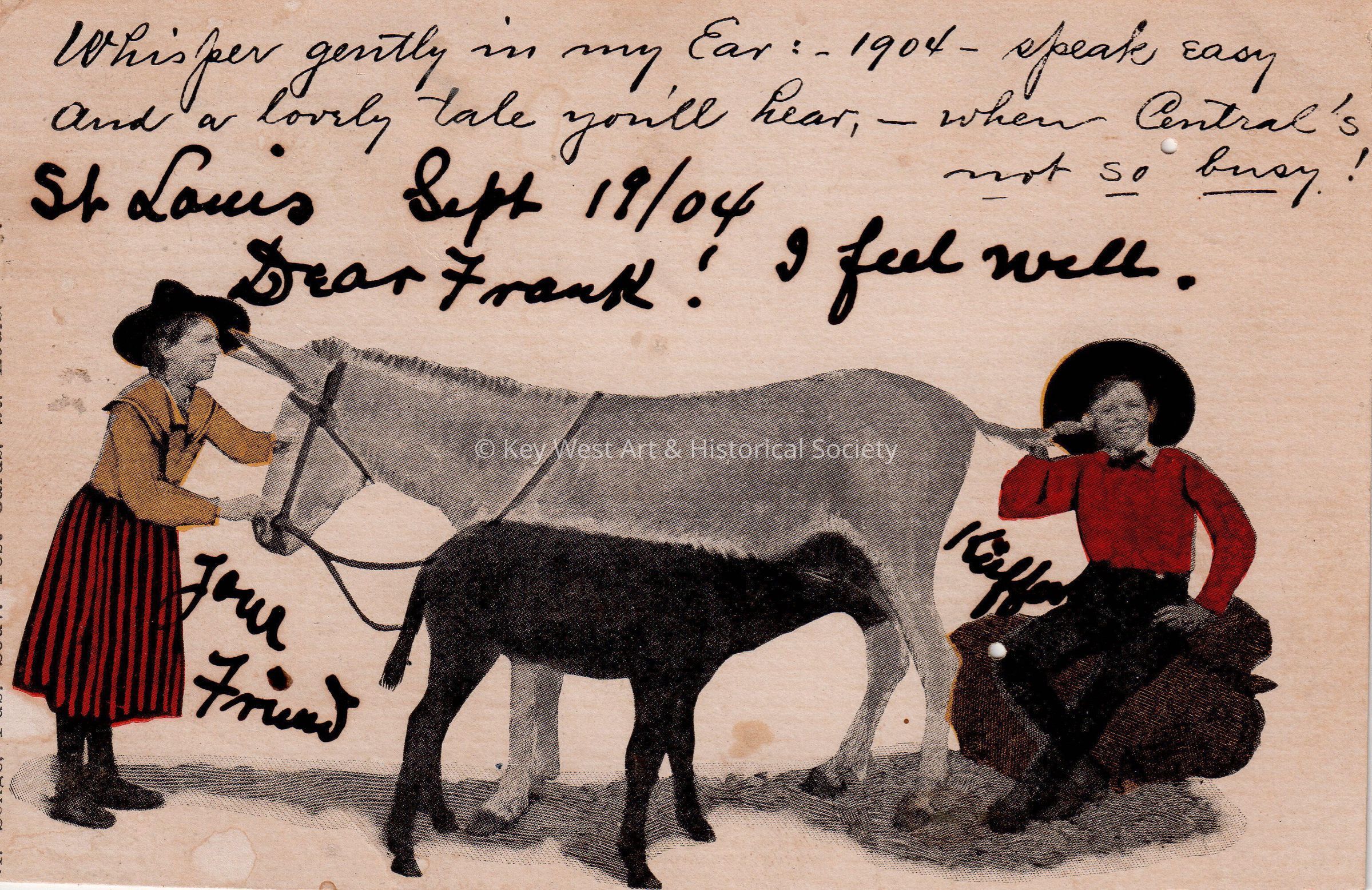 Postcard depicting a girl, boy, and two donkeys. The caption reads, ‘Whisper gently in my Ear – 1904 – speak easy and a lovely tale you’ll hear – when Central’s not so busy!' The message on the front reads, ‘St. Louis, September 19, 1904, Dear Frank: I feel well. Your friend, Kieffer.’ The card is addressed to Mr. Frank Mumford, 803 Sansom Street, Philadelphia, Pennsylvania, and is postmarked Philadelphia, September 21, 1904.Collection