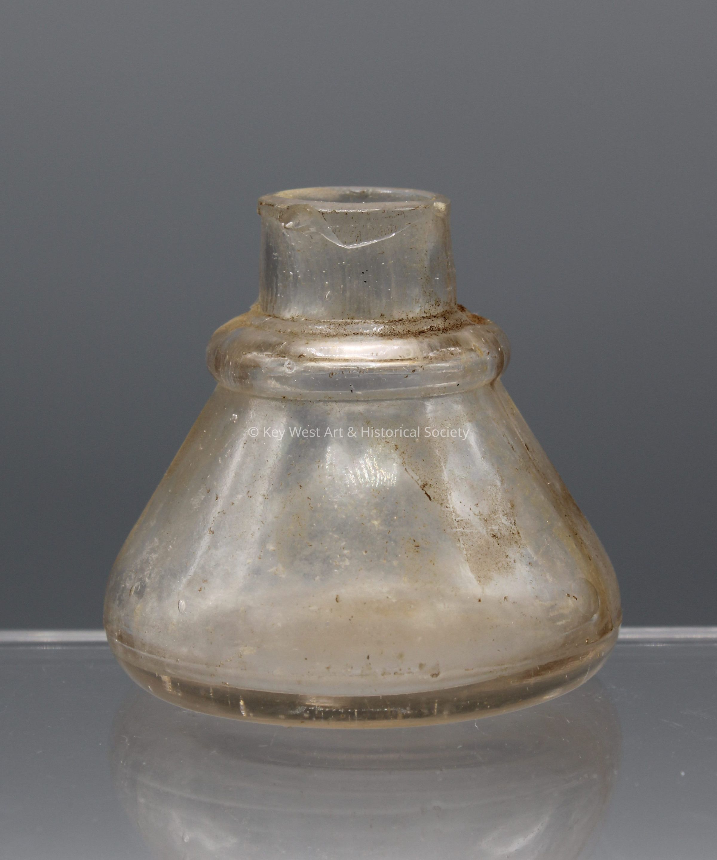 Short colorless glass bottle with a thick base and tapered neck, likely an inkwell.