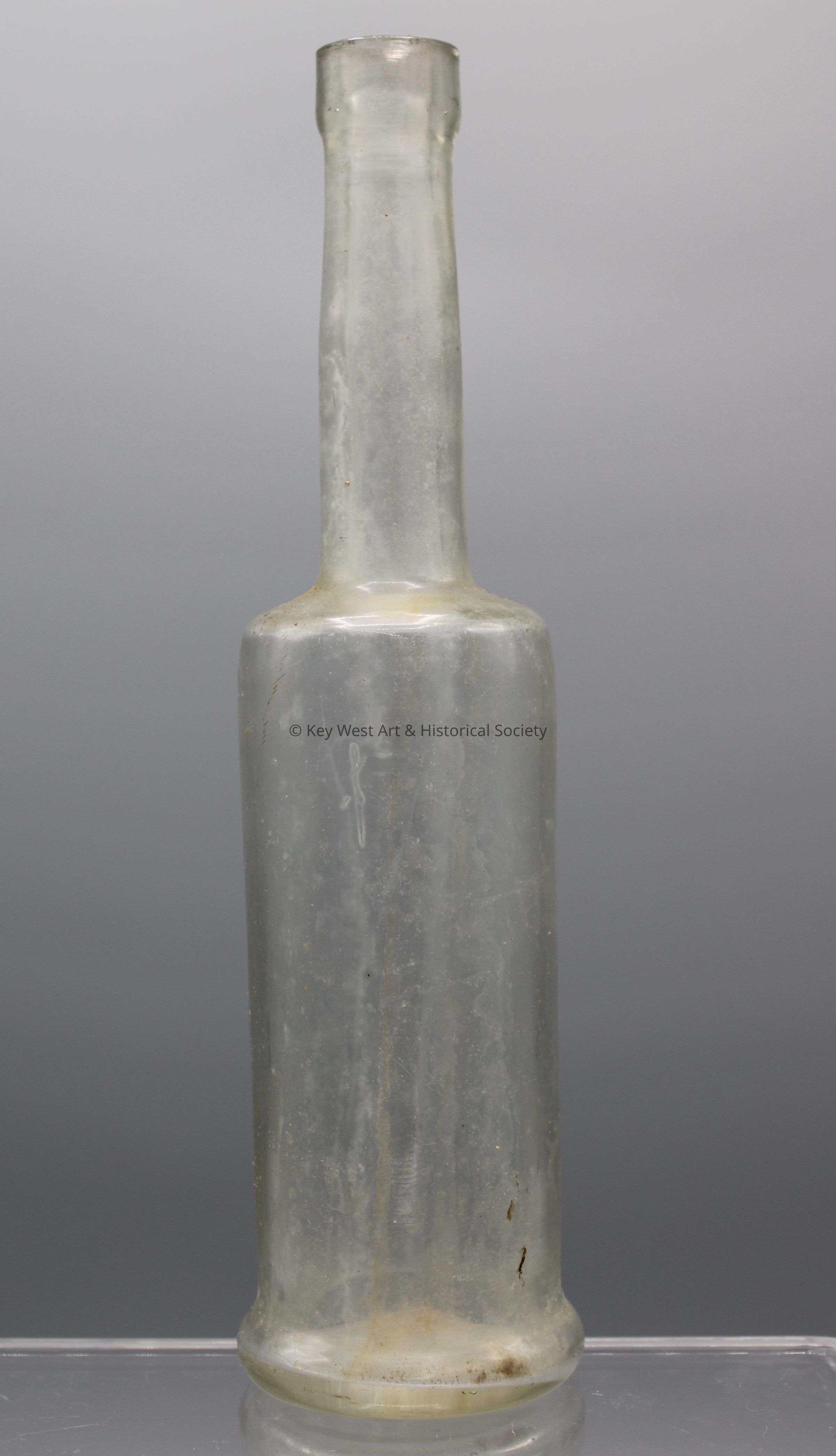 Colorless glass bottle with a long, thin neck and no markings.