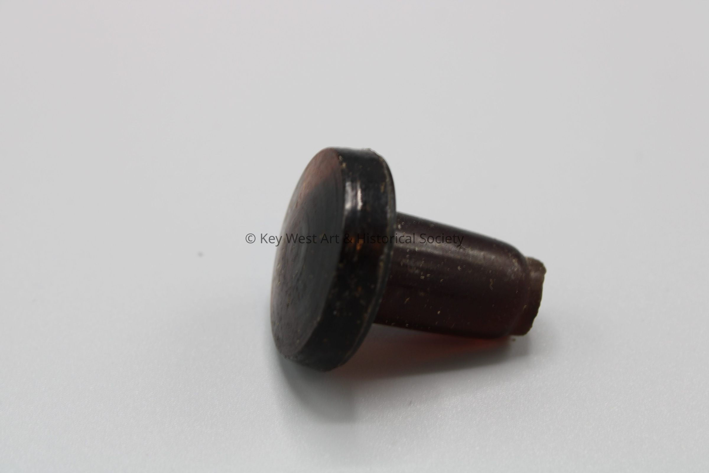 Dark amber glass stopper with a flat top and cylindrical projection.