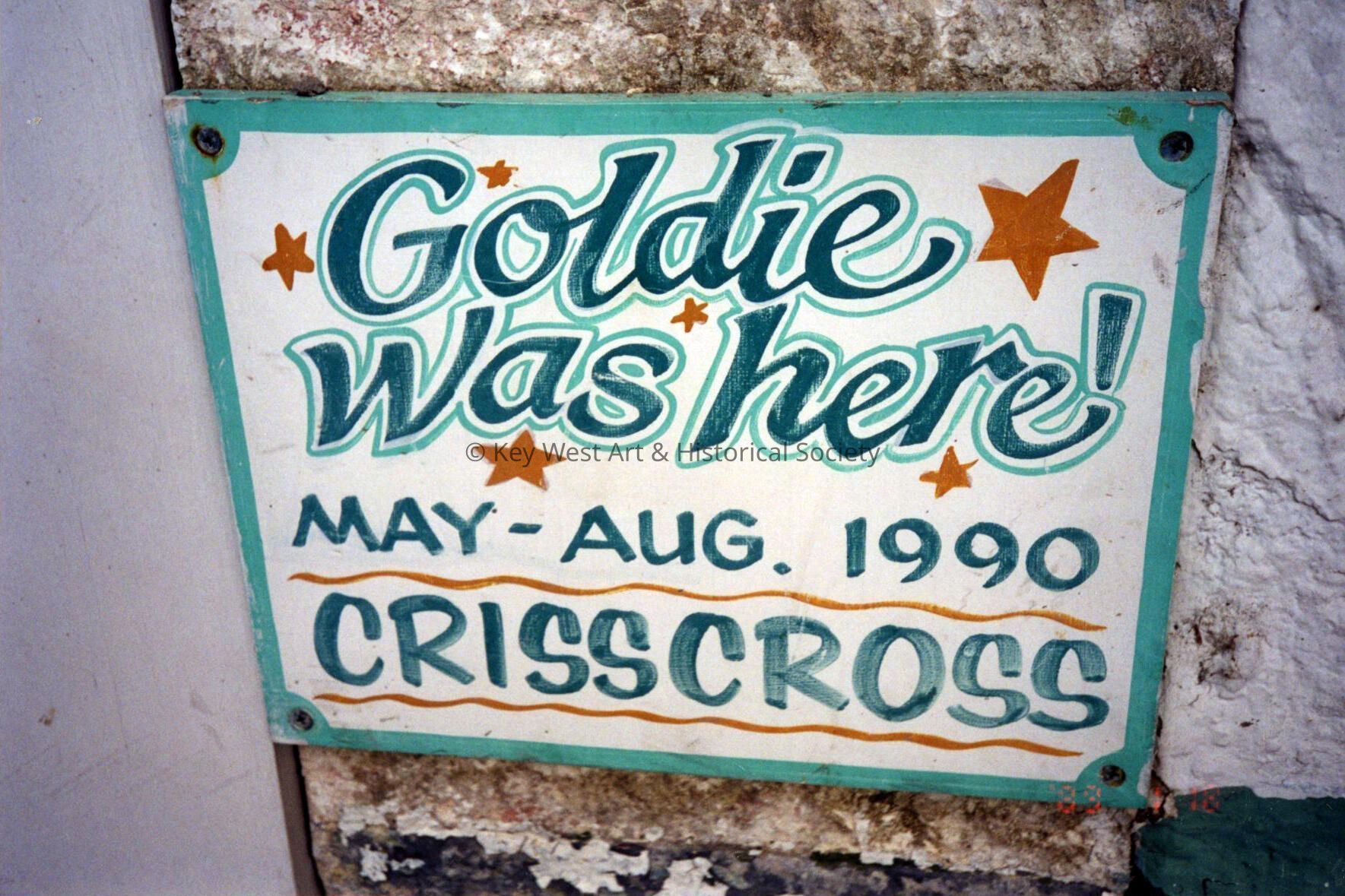 Color photograph taken by historian James M. Goode of a 'Goldie was here, May -Aug 1990, Crisscross' sign at a hotel on Fleming Street during a trip to Key West in February 2001. Printed from Roll 3.Photograph Details