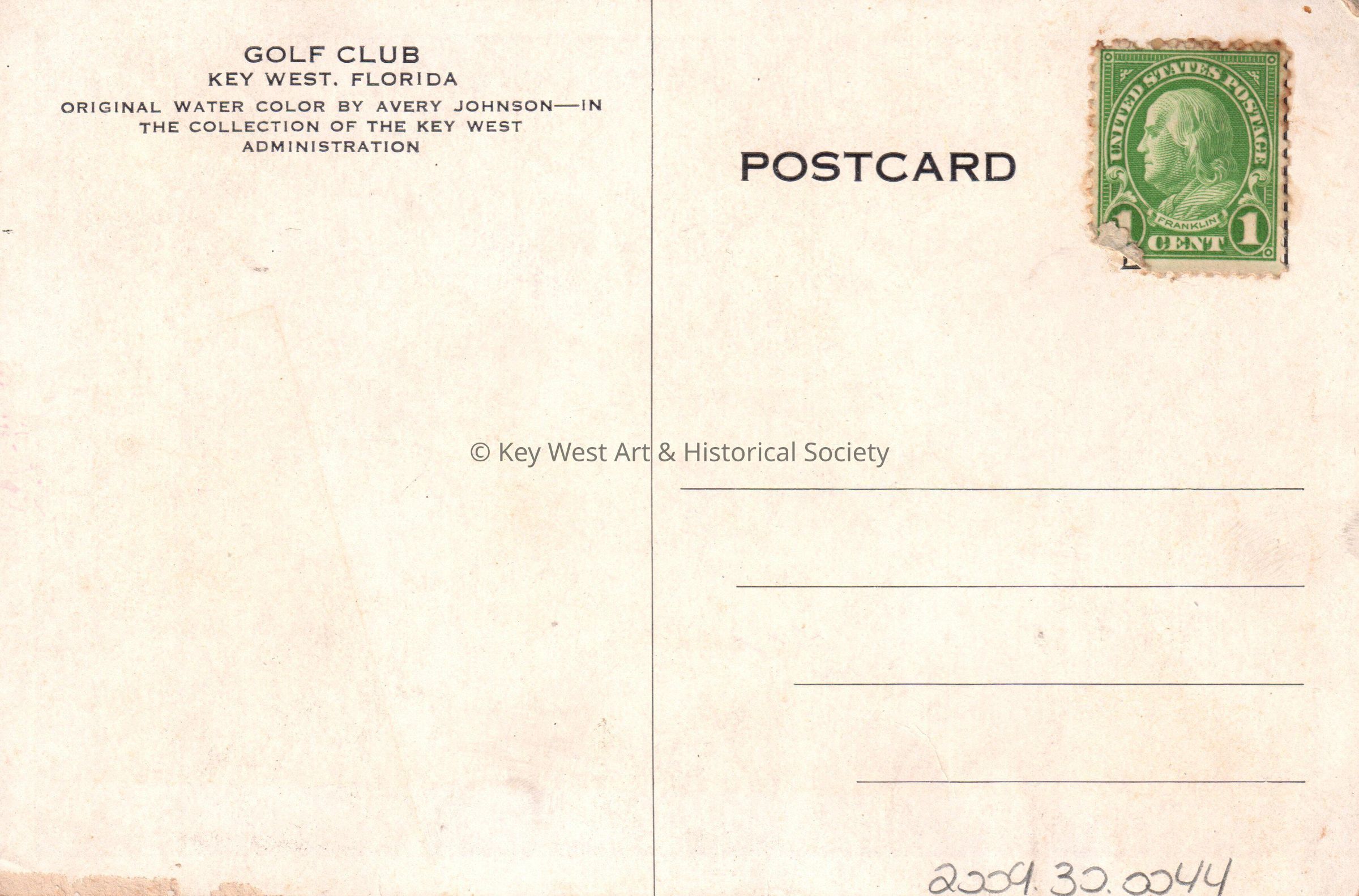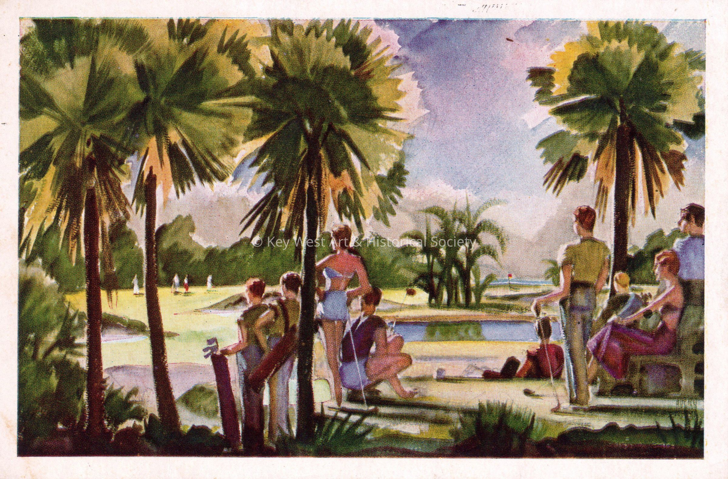 Postcard of a painting of men and women with golf clubs on a golf course. The description on the verso reads, ‘Golf Club, Key West, Florida.’Subject Place