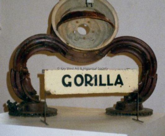 Freestanding sign by Stanley Papio corresponding to a sculpture representing a gorilla waving with his left hand. Fabricated from ferrous metal parts.Type of Sculpture