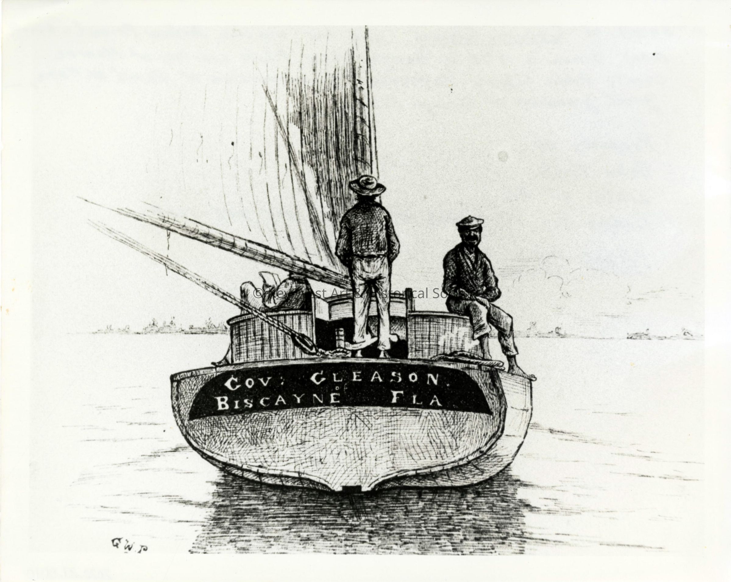 Black and white photograph of a sketch of Governor Gleason and her captain Andrew Price drawn by George Potter. The Governor Gleason was a broad-beamed schooner about 30 feet in length. Captain Price was a Black man.