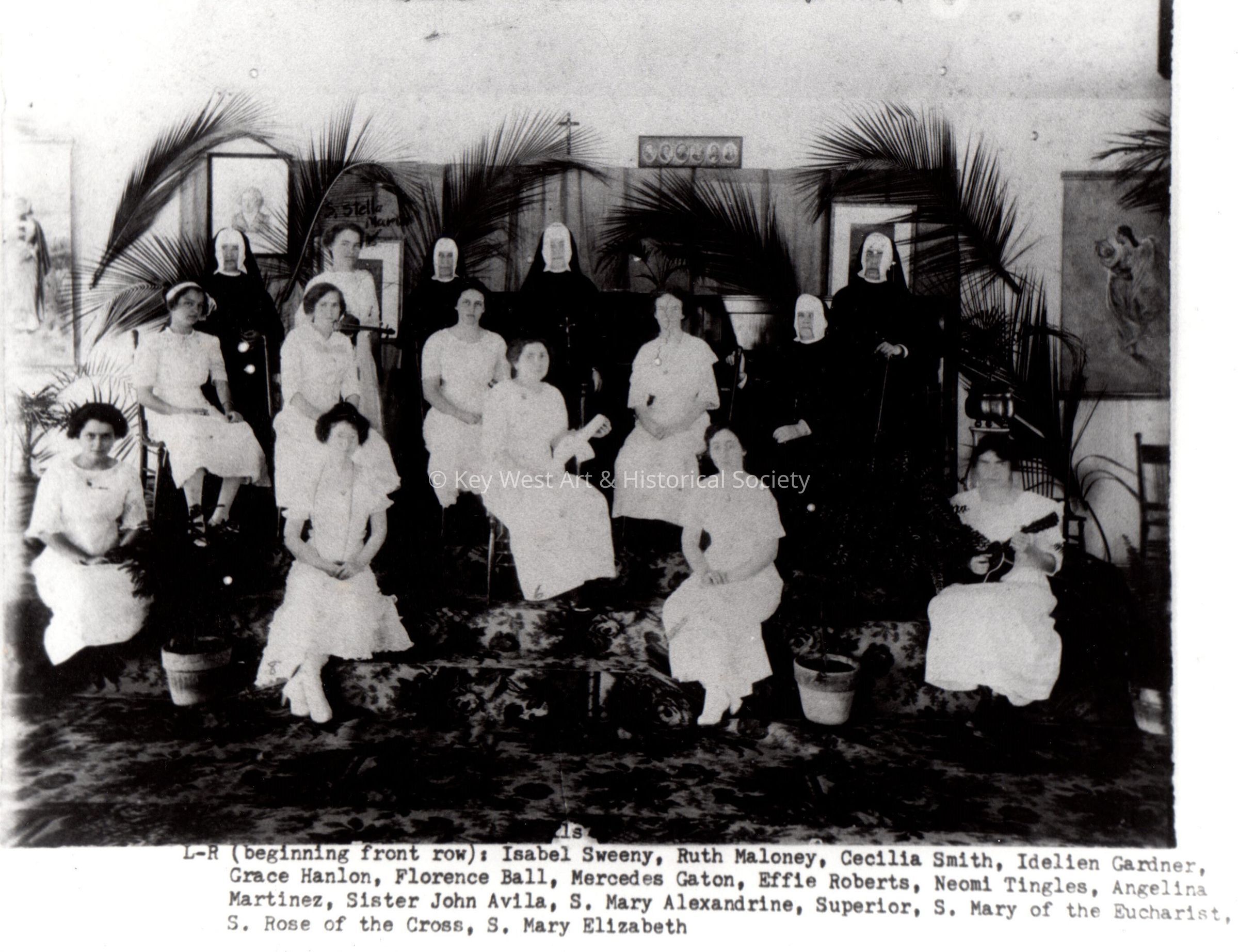 Miss Florence Ball's graduation group of nuns and students from the Convent of Mary Immaculate in Key West, on June 12, 1913. L-r front row - Isabel Sweeny, Ruth Maloney, Cecilia Smith, Idelien Gardiner, Grace Hanlon, Florence Ball, Mercedes Gaton, Effie Roberts, Neomi Tingles, Angelina Martinez, Sister John Avila, S. Mary Alexandrine, Superior, S. Mary of the Eucharist, S. Rose of the Cross, and S. Mary Elizabeth.Collection