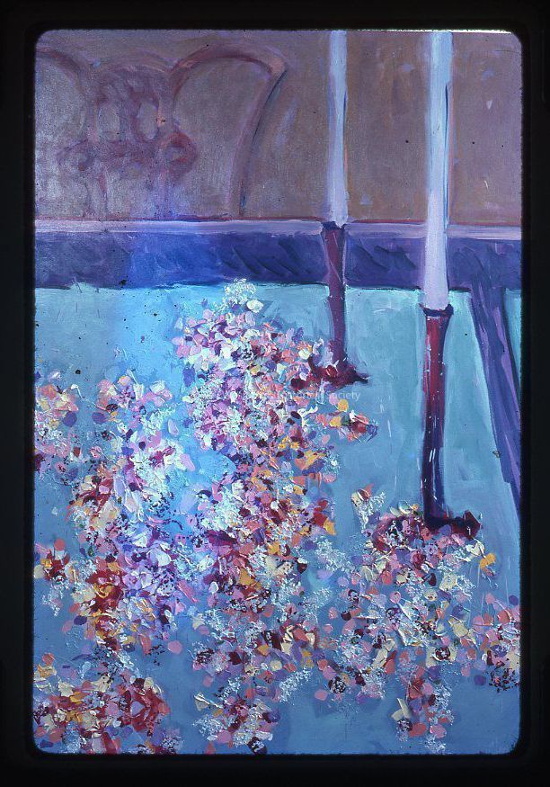 35mm color slide depicting the oil on canvas painting 'Grandmother's Table' by Ron Clemons. The work shows the corner of a table with two tall candles and flowers.