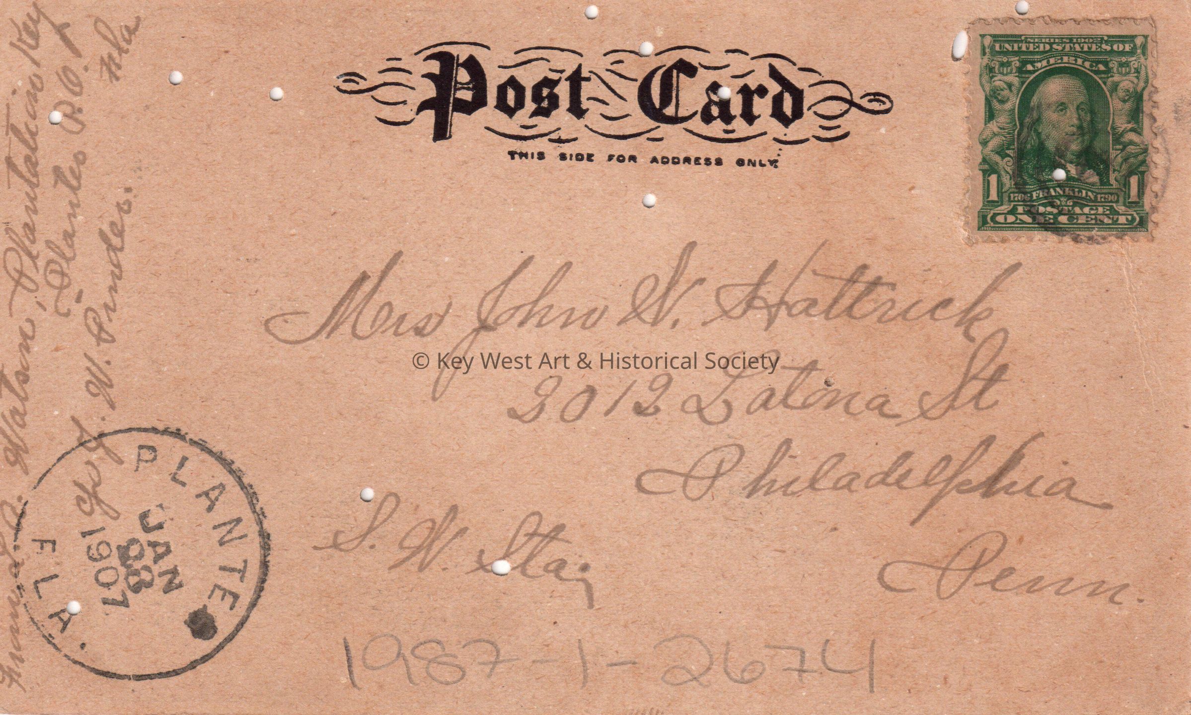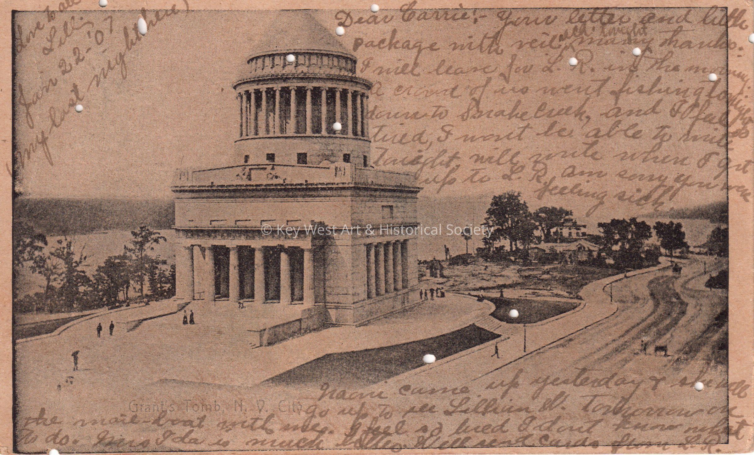 Postcard depicting a memorial. The caption reads, ‘Grant’s Tomb, New York City’. The message on the front reads, ‘Dear Carrie, your letter and little package with veil received tonight. Many thanks. I will leave for L.R. in the morning. A crowd of us went fishing tonight down to snake creek, and I feel so tired, I won’t be able to write tonight. Will write when I get up to L.R. I am sorry you were feeling sick. Naomi came up yesterday and she will go up to see Lillian W. tomorrow on the mail boat with me. I feel so tired I don’t know what to do. Mrs. Ida is much better. Will send cards from L.R. Love to all, Lillian, January 22, 1907 (my last night here).’ The message on the verso reads, ‘From L.A. Watson, Plantation Key, Planter P.6, Florida, care of J.W. Pinder.’ The card is addressed to Mrs. John W. Hattrick, 2012 Latona Street, Southwest Station, Philadelphia, Pennsylvania, and is postmarked Planter, Florida, January 23, 1907.Collection