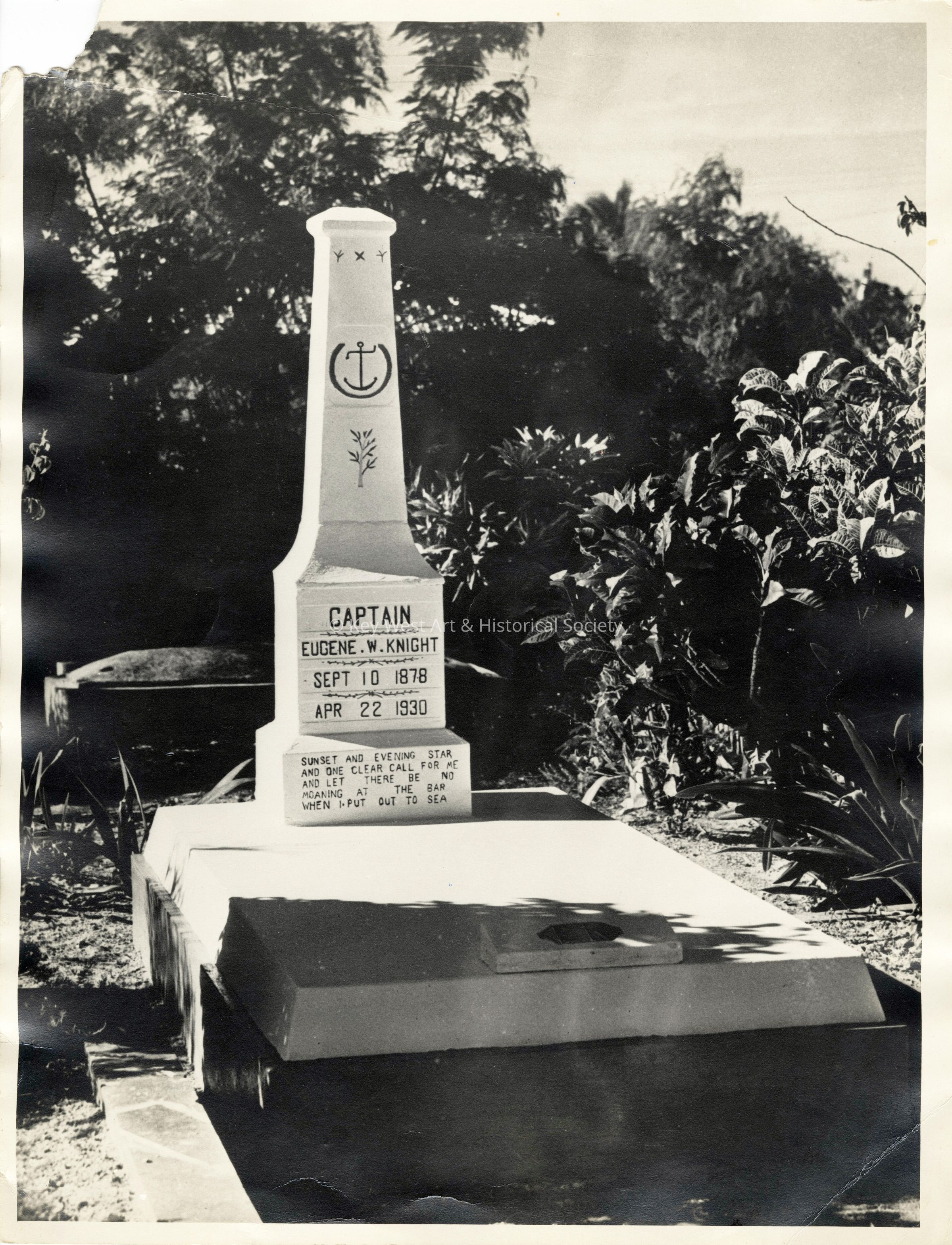 Black and white photograph of the grave marker of Captain Eugene W. Knight. "Captain Eugene W. Knight. September 10, 1878 - April 22, 1930 Sunset and evening star and one clear call for me and let there be no moaning at the bar when I put out to sea"Collection