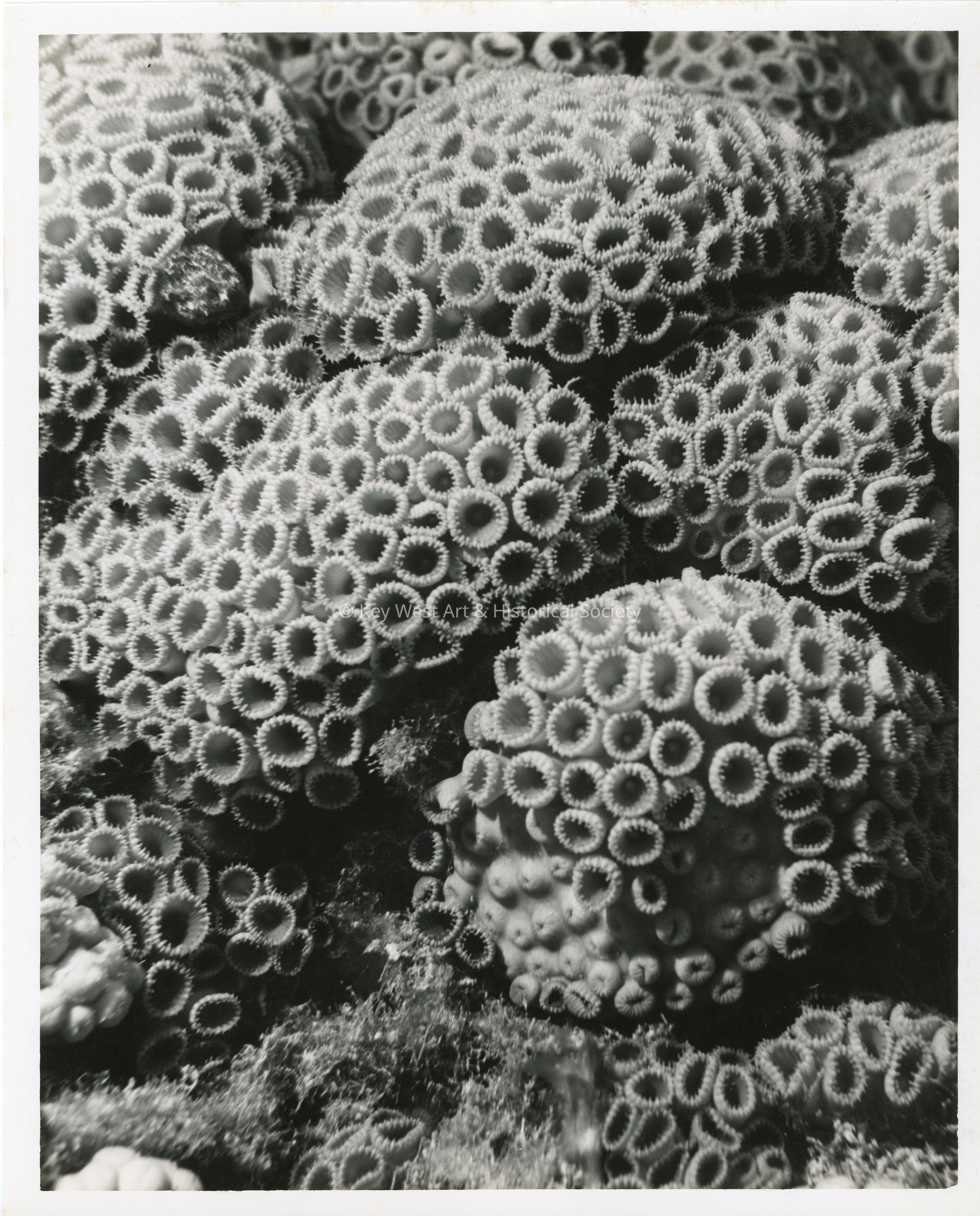 Black and white photograph of great star coral along the Florida Reef.